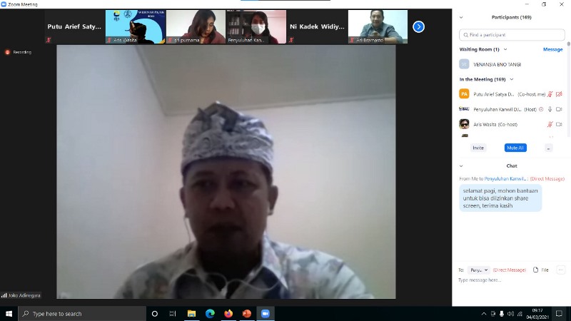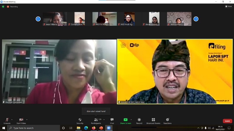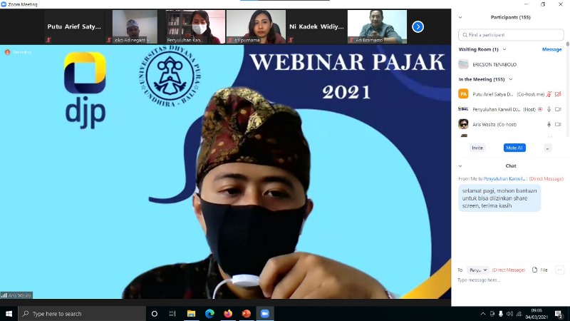 Kantor Wilayah Direktorat Jenderal Pajak (Kanwil DJP) Bali bekerja sama dengan Tax Center Universitas Dhyana Pura mengadakan Webinar Perpajakan dengan tema “Perpanjangan Insentif Pajak di tengah pandemic Covid-19” melalui media Zoom di Bali (Kamis, 4/3). Acara ini diikuti oleh 230 peserta yang berasal dari dosen, mahasiswa hingga masyarakat umum.