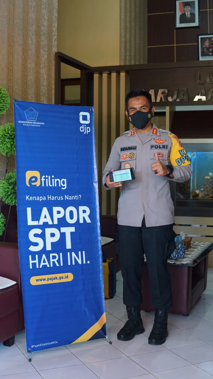 Kapolres Wakatobi Suharman Sanusi melaporkan SPT Tahunan melalui e-Filing dengan asistensi Tim Penyuluh dan Humas Kantor Pelayanan Pajak (KPP) Pratama Baubau di Kantor Kepolisian Resor Wakatobi (Kamis, 4/3). Tim Penyuluh dan Humas KPP Pratama Baubau disambut dengan ramah oleh Aparat Kepolisian Resor Wakatobi.