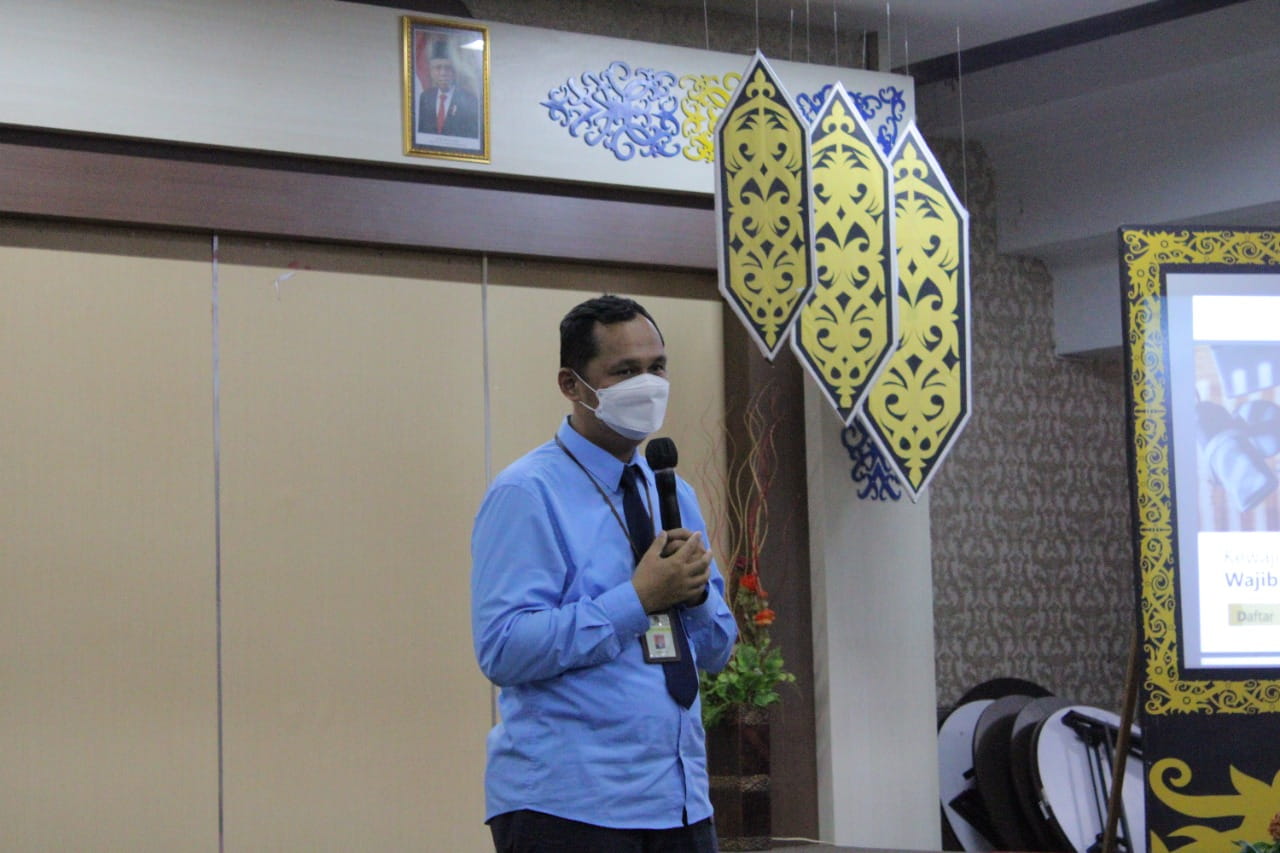 Fungsional Penyuluh Pajak Ikhwan Latief memberikan materi tentang simulasi pengisian Surat Pemberitahuan (SPT) Tahunan Orang Pribadi karyawan yang memiliki bukti pemotongan pajak penghasilan melalui e-Filing.