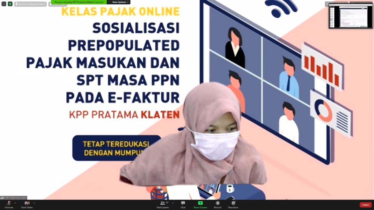 Kantor Pelayanan Pajak Pratama Klaten menyelenggarakan kelas pajak dengan tema Sosialisasi Prepopulated Pajak Masukan dan SPT Masa PPN Pada e-Faktur di Klaten (Kamis, 24/9). Kelas Pajak yang diselenggarakan secara daring ini dibuka oleh Kepala KPP Pratama Klaten yang diwakili oleh Kepala Seksi Waskon I KPP Pratama Klaten Antonius Winarno dengan Wahyu Indrianti ,Account Representative KPP Pratama Klaten, selaku pemateri.