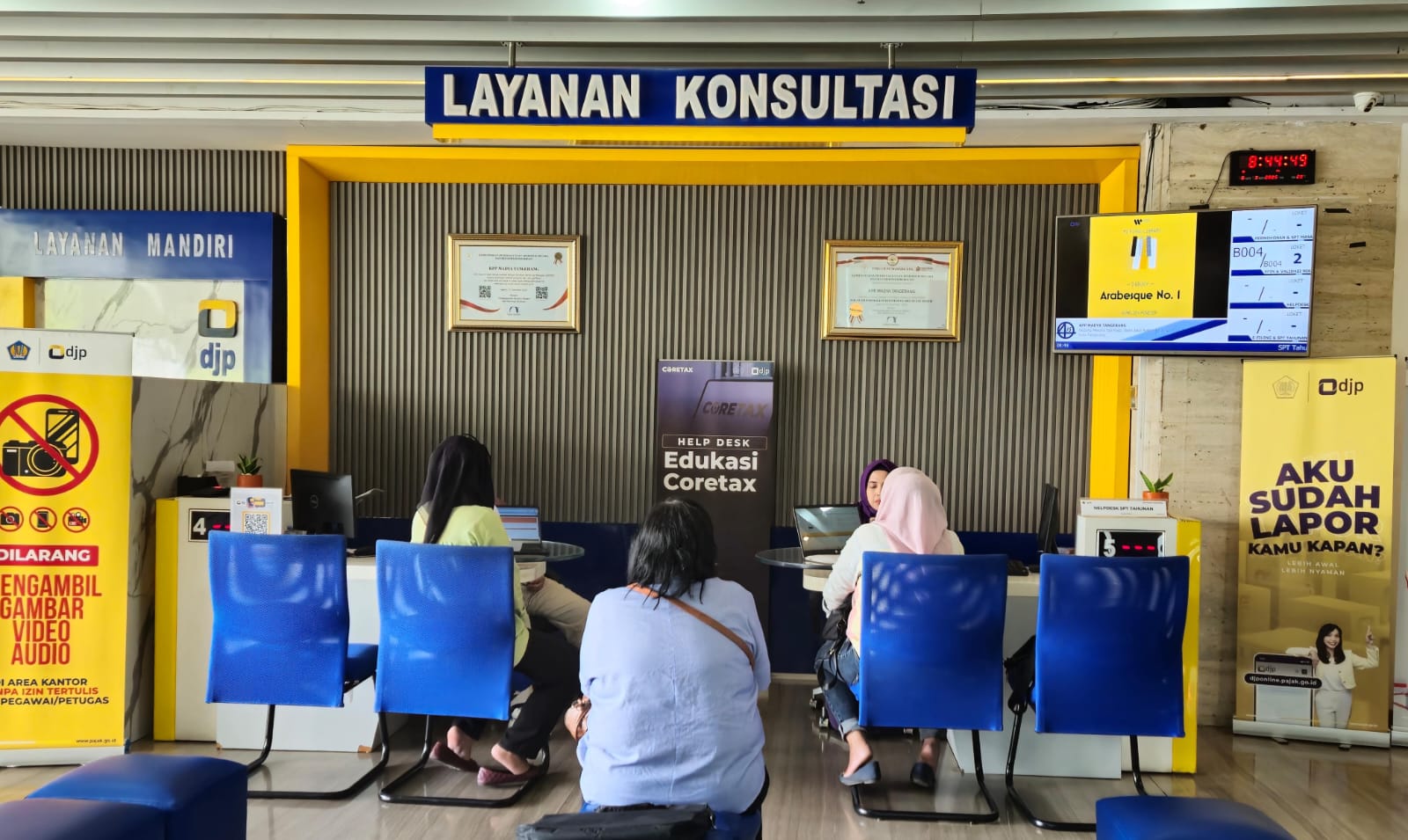 Tim Helpdesk Coretax DJP Kantor Pelayanan Pajak (KPP) Madya Tangerang memberikan konsultasi pada salah satu Wajib Pajak Badan terkait Coretax DJP di loket Tempat Pelayanan Terbaru (TPT) Kantor Pelayanan Pajak (KPP) Madya Tangerang, Jalan Jalur Sutera Barat Nomor 3, Panunggangan Timur, Pinang, Kota Tangerang, Banten (Kamis, 6/3).