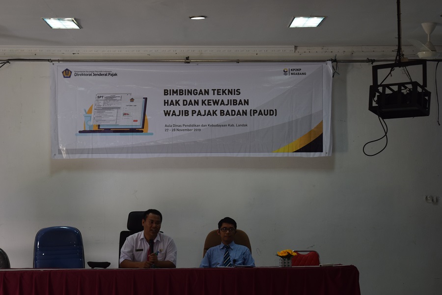 Kantor Pelayanan Penyuluhan dan Konsultasi (KP2KP) Ngabang mengadakan kegiatan Bimbingan Teknis (Bimtek) Perpajakan bagi para pengurus PAUD se-Kabupaten Landak di Aula Dinas Pendidikan dan Kebudayaan Kabupaten Landak (Rabu, 27/11). Kegiatan BImtek selama dua hari hingga Kamis 28 November 2019 ini diikuti oleh lebih dari 50 peserta.