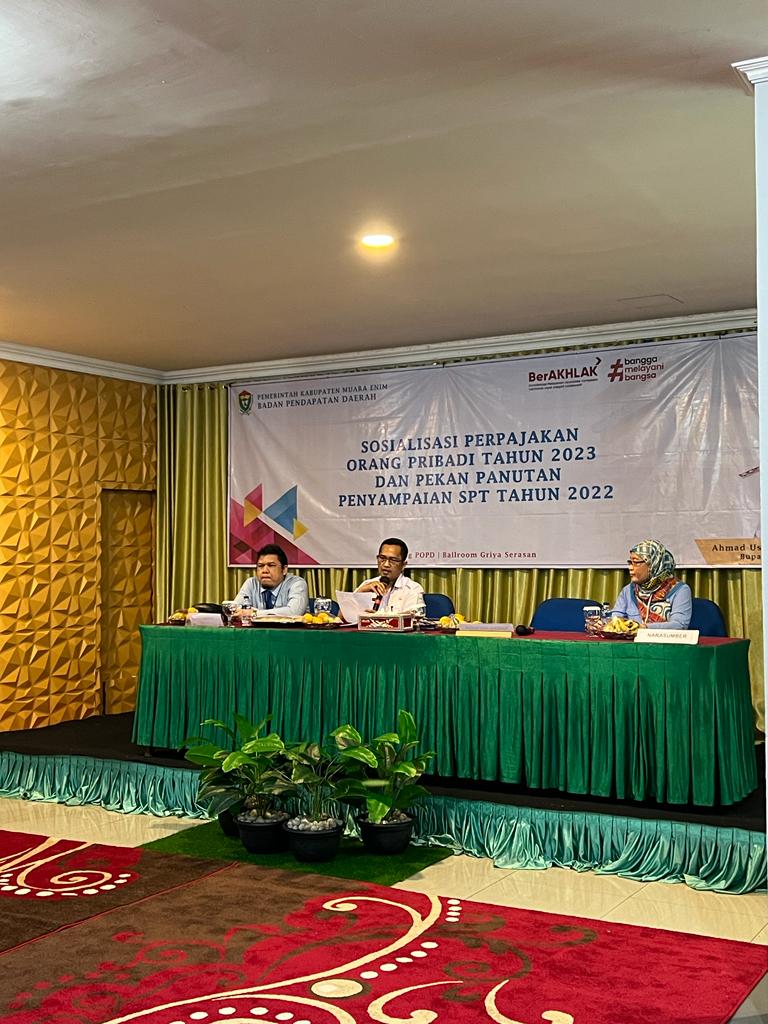 Kantor Pelayanan Pajak (KPP) Pratama Prabumulih bekerja sama dengan Badan Pendapatan Daerah Muara Enim dalam mengadakan kegiatan sosialisasi pengisian SPT Tahunan Orang Pribadi di Hotel Serasan Sekundang Muara Enim, Sumatera Selatan (Rabu, 8/3).