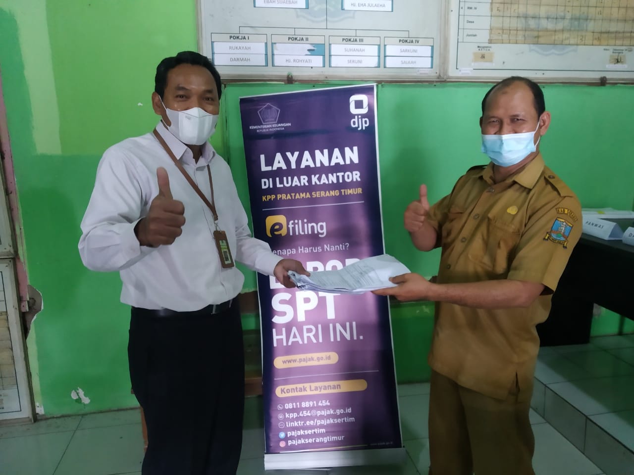 Kantor Pelayanan Pajak (KPP) Pratama Serang Timur mengadakan kegiatan Layanan Di luar Kantor (LDK) untuk memberikan asistensi pengisian SPT Tahunan di Desa Kibin (Senin, 21/6). Kegiatan ini dilaksanakan dengan tetap mematuhi protokol kesehatan yang berlaku.