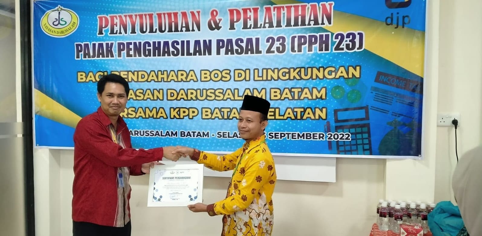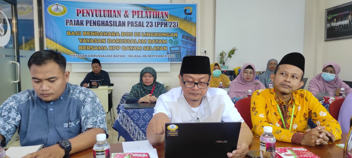 Kantor Pelayanan Pajak (KPP) Pratama Batam Selatan bekerja sama dengan Yayasan Darussalam Batam menyelenggarakan kegiatan penyuluhan dan pelatihan Pajak Penghasilan (PPh) Pasal 23 bagi Bendahara Bantuan Operasional Sekolah (BOS) di Lingkungan Yayasan Darussalam Batam bertempat di Ruang Pertemuan Yayasan Darussalam Batam, Kepulauan Riau (Selasa, 6/9). Tim Fungsional Asisten Penyuluh KPP Pratama Batam Selatan disambut langsung oleh Direktur Pendidikan Yayasan Darussalam Batam Omas Sauludin.