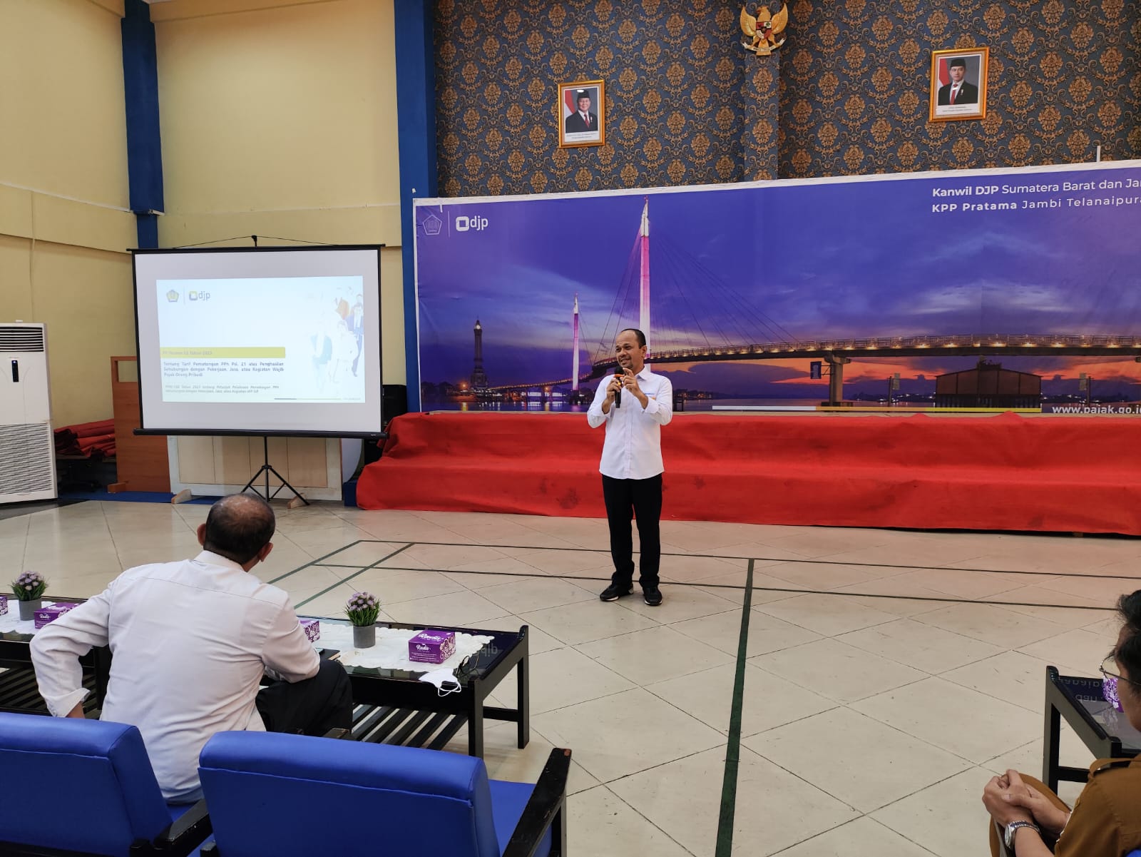 Kantor Pelayanan Pajak (KPP) Pratama Jambi Telanaipura menyelenggarakan kegiatan Sosialisasi Peraturan Pemerintah (PP) Nomor 58 tahun 2023 tentang Tarif Pemotongan Pajak Penghasilan (PPh) Pasal 21 atas Penghasilan Sehubungan dengan Pekerjaan, Jasa dan Kegiatan Wajib Pajak Orang Pribadi bagi pengelola keuangan Badan Pengelolaan Keuangan dan Aset Daerah (BPKAD) Kota Jambi. Kegiatan ini berlangsung di Aula Adhikari Danadyaksa KPP Pratama Jambi Telanaipura, Kota Jambi (Senin, 21/4).