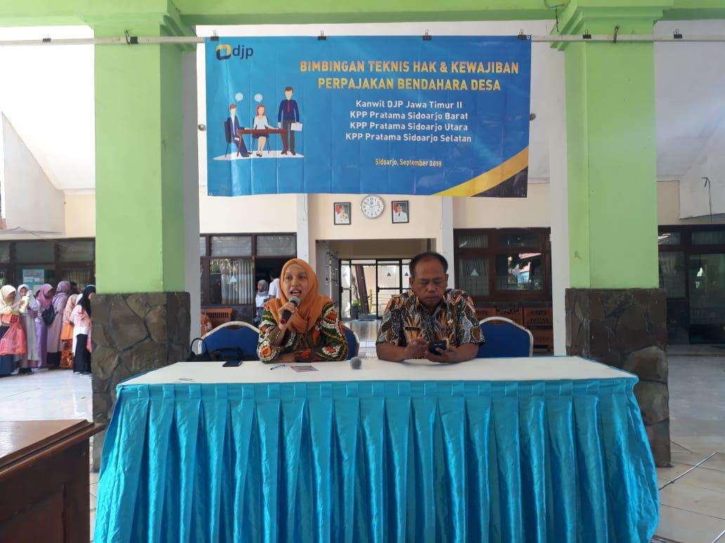 Kantor Wilayah DJP Jawa Timur II bekerja sama dengan KPP Pratama Sidoarjo Barat mengadakan acara Bimbingan Teknis Hak dan Kewajiban Perpajakan Bendahara Desa di Pendopo Balai Kecamatan Krian, Sidoarjo (Selasa, 10/9). Acara dihadiri oleh 32 orang peserta yang merupakan Bendahara Desa dan pengelola teknis dari wilayah Kecamatan Krian. Para peserta antusias menyimak materi yang disampaikan oleh Kepala Seksi Bimbingan Penyuluhan dan Pengelolaan Dokumen Nanik Tri Wahyuningsih mengenai hak dan kewajiban perpajakan yang harus dipenuhi oleh Bendahara Desa.