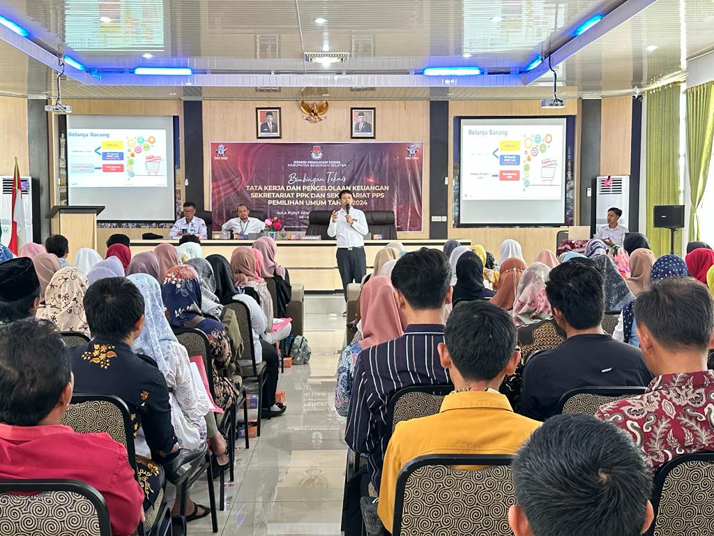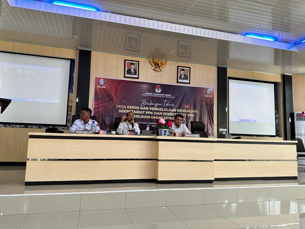 Komisi Pemilihan Umum (KPU) Bengkulu Selatan menyelenggarakan Bimbingan Teknis (Bimtek) Pengelolaan Keuangan bagi Sekretariat Panitia Pemilihan Kecamatan (PPK) dan Panitia Pemungutan Suara (PPS) wilayah Kecamatan Air Nipis dan Bunga Mas. Kegiatan berlokasi di Aula Pusat Layanan Haji dan Umrah Terpadu (PLHUT) Kementerian Agama Kabupaten Bengkulu Selatan (Senin, 6/3).