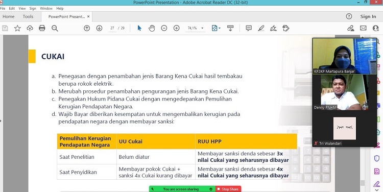 Kantor Pelayanan, Penyuluhan, dan Konsultasi Perpajakan (KP2KP) Martapura melakukan sosialisasi peraturan perpajakan terbaru mengenai UU No. 7 Tahun 2021 tentang Harmonisasi Peraturan Perpajakan (UU HPP) (Selasa, 23/11). Acara kali ini diselenggarakan secara daring melalui zoom meeting di ruang kelas pajak KP2KP Martapura, Kota Martapura.