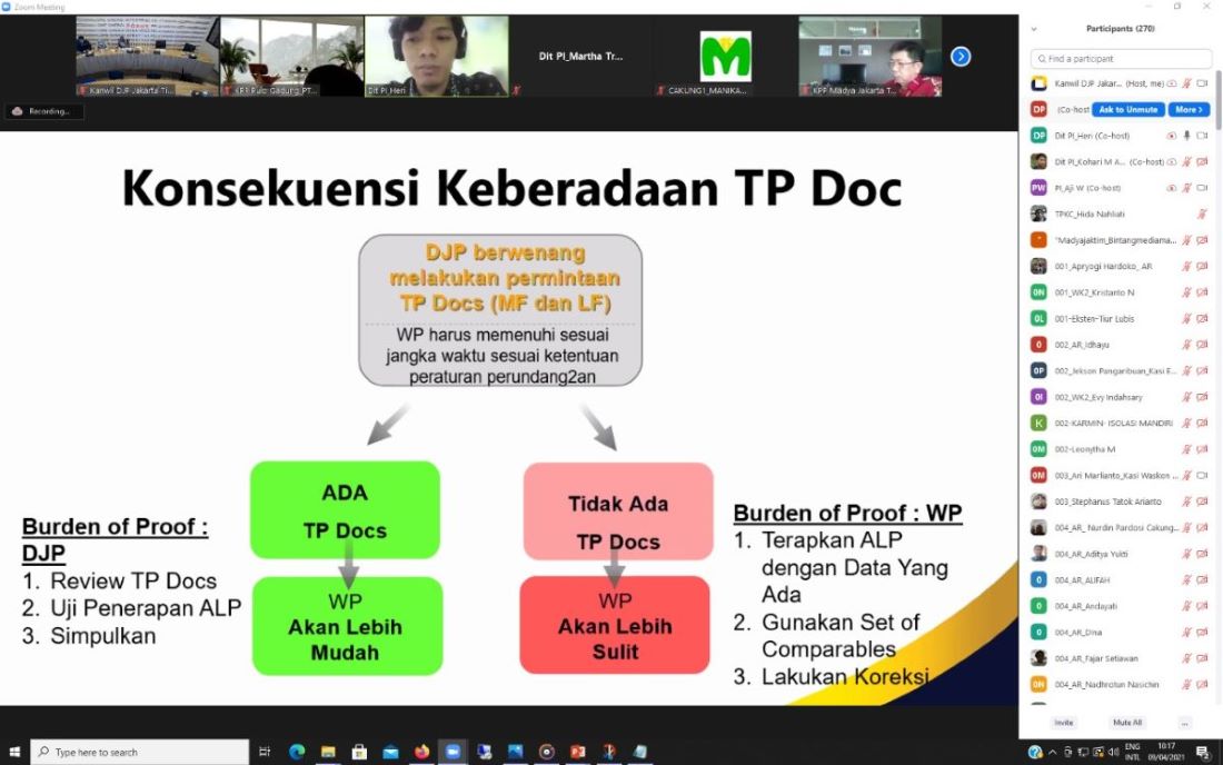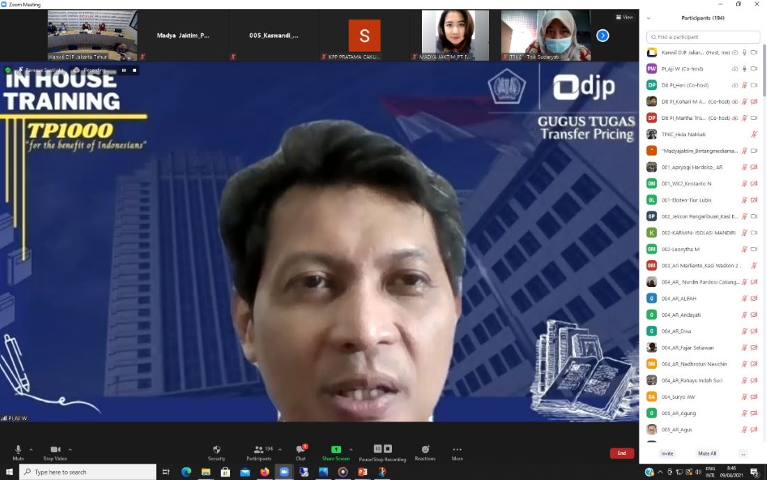 Kantor Wilayah DJP Jakarta Timur menyelenggarakan kegiatan Edukasi Transfer Pricing secara daring melalui aplikasi Zoom Meeting di Ruang Konferensi Gedung Pulomas Office Lantai 9, Jakarta (Jumat, 9/4). Kegiatan edukasi ini dibuka oleh Kepala Bidang Pemeriksaan, Penagihan, Intelijen, dan Penyidikan (PPIP) dan dihadiri oleh wajib pajak yang memiliki transaksi afiliasi dari masing-masing kantor pelayanan pajak di lingkungan Kantor Wilayah DJP Jakarta Timur.