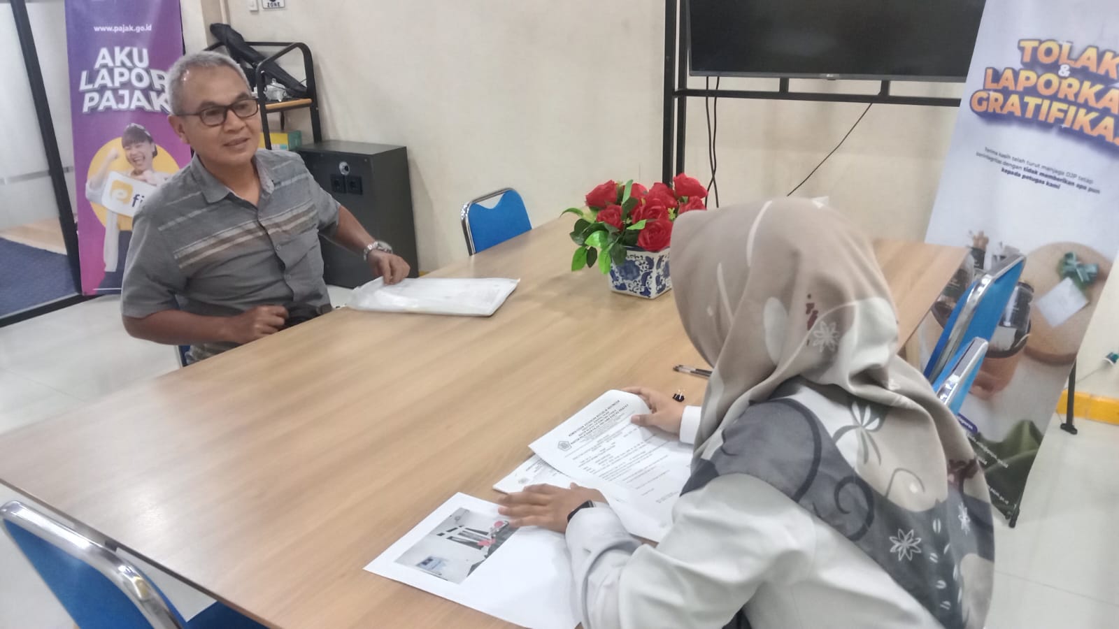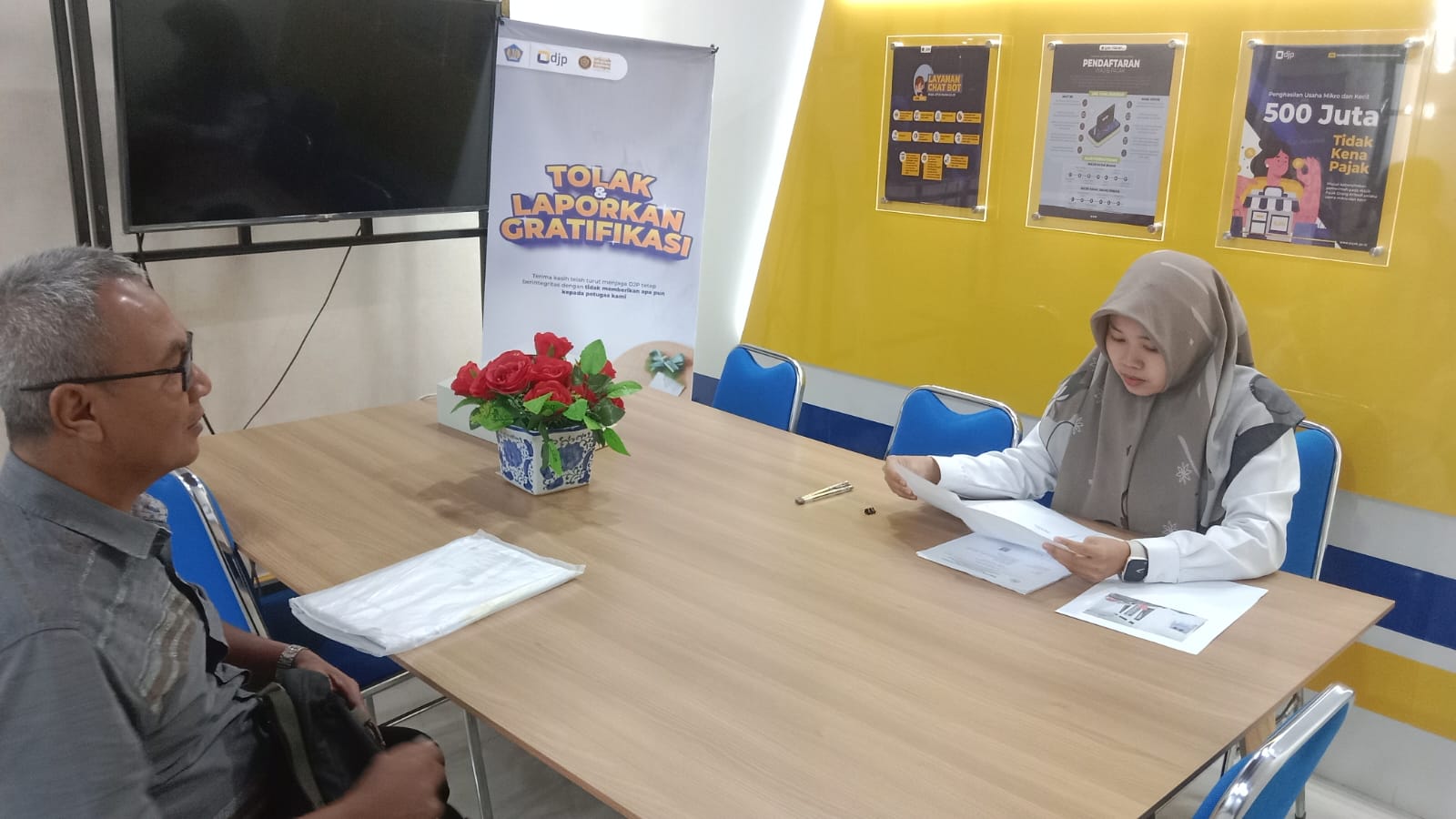 Petugas Kantor Pelayanan Pajak (KPP) Pratama Rantau Prapat mengadakan wawancara dengan CV Amani Sempurna yang mengajukan permohonan Pengusaha Kena Pajak (PKP) di Ruang Konsultasi KP2KP Rantau Prapat, Jalan Jend. Ahmad Yani, Rantauprapat, Kec. Rantau Utara, Kabupaten Labuhanbatu (Senin, 24/2).