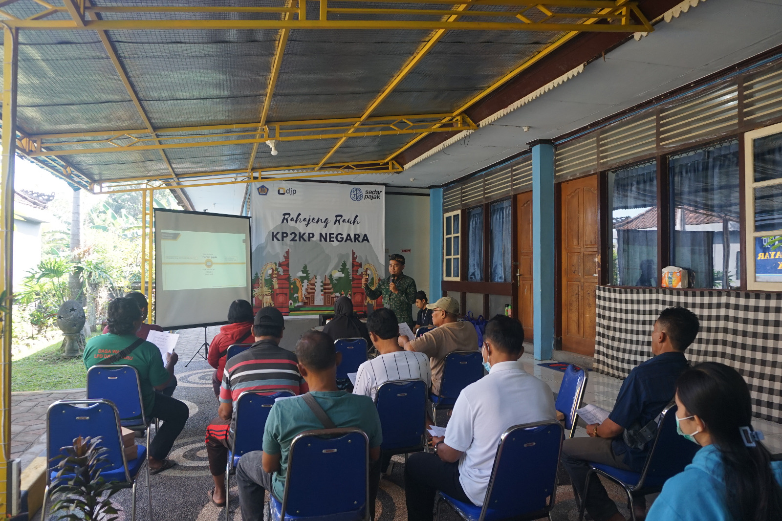 Gusti Putu Rizky Widyanata dan Muhammad Arif Luqman Syah selaku pelaksana KP2KP Negara menyampaikan materi Peraturan Pemerintah (PP) Nomor 23 Tahun 2018 yang diperbarui dengan PP Nomor 55 Tahun 2022 terkait fasilitas pembebasan pajak bagi Wajib Pajak Orang Pribadi (WPOP) usahawan/UMKM yang memiliki peredaran penghasilan bruto kurang dari 500 juta rupiah dalam setahun. Kemudian para wajib pajak dipandu untuk mengisi SPT Tahunan menggunakan formulir SPT 1770 yang dikhususkan untuk WP OP usahawan/pelaku UMKM.