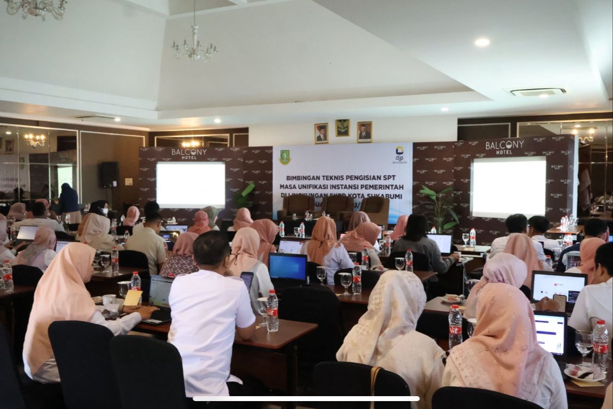 Kepala Subbagian Keuangan dan Bendahara dari 31 Satuan Kerja Perangkat Daerah (SKPD) di lingkungan Pemerintah Kota Sukabumi menghadiri acara Bimbingan Teknis Pengisian Surat Pemberitahuan (SPT) Masa Unifikasi. Acara yang diinisiasi Kantor Pelayanan Pajak (KPP) Pratama Sukabumi ini berlangsung di Aula Lantai 5 Hotel Balcony Sukabumi, Jawa Barat (Rabu, 15/11). Acara lalu dibuka oleh Kepala Bidang Perbendaharaan Kota Sukabumi M. Iqbal Inayatullah.