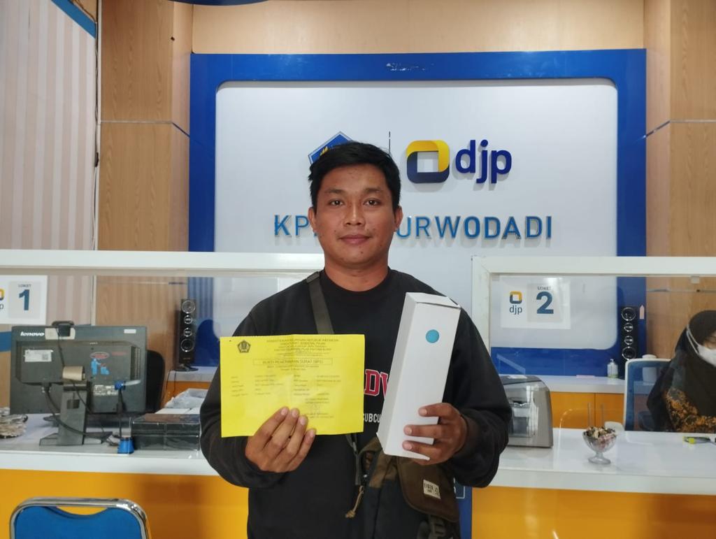 Kantor Pelayanan, Penyuluhan, dan Konsultasi Perpajakan (KP2KP) Purwodadi memberikan apresiasi kepada wajib pajak yang melaporkan SPT (Surat Pemberitahuan) Tahunan 2023 pada hari pertama kerja di tahun 2024 di Purwodadi, Grobogan (Selasa, 2/1). Para wajib pajak ini diberikan apresiasi sebagai bentuk ucapan terima kasih atas dedikasinya menyampaikan SPT Tahunan tepat waktu.