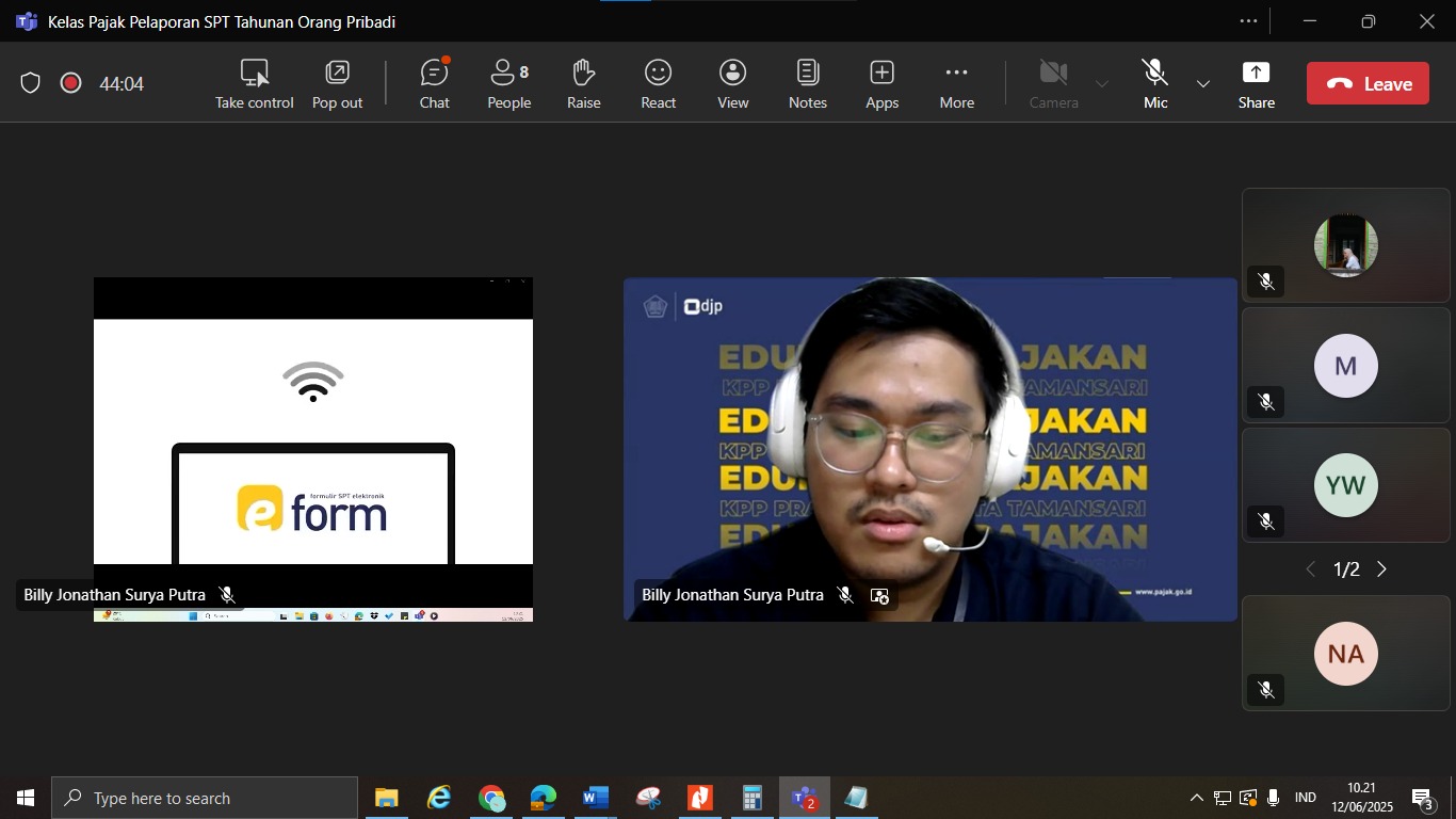 Dalam rangka mendukung kelancaran pelaporan Surat Pemberitahuan (SPT) Tahunan Tahun, KPP Pratama Jakarta Tamansari menyelenggarakan kegiatan Sosialisasi SPT Tahunan Orang Pribadi secara daring melalui Microsoft Teams (Kamis, 12/6). Kegiatan ini merupakan bagian dari program Sosialisasi SPT Serentak yang digagas oleh Kantor Wilayah DJP Jakarta Barat dan dilaksanakan secara serentak oleh seluruh KPP di bawahnya.