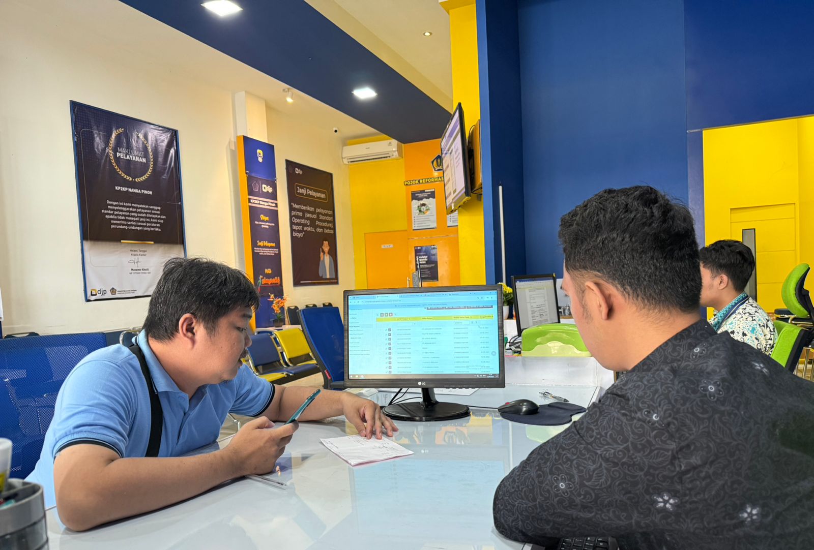 Penyuluh Kantor Pelayanan, Penyuluhan, dan Konsultasi Perpajakan (KP2KP) Nanga Pinoh, Iqbal Pasuja, membantu Wajib Pajak Pengusaha Kena Pajak (PKP) membuat retur faktur pajak masukan pertama kali menggunakan akun Coretax DJP di Tempat Pelayanan Terpadu KP2KP Nanga Pinoh, Kabupaten Melawi (Jumat, 13/6).