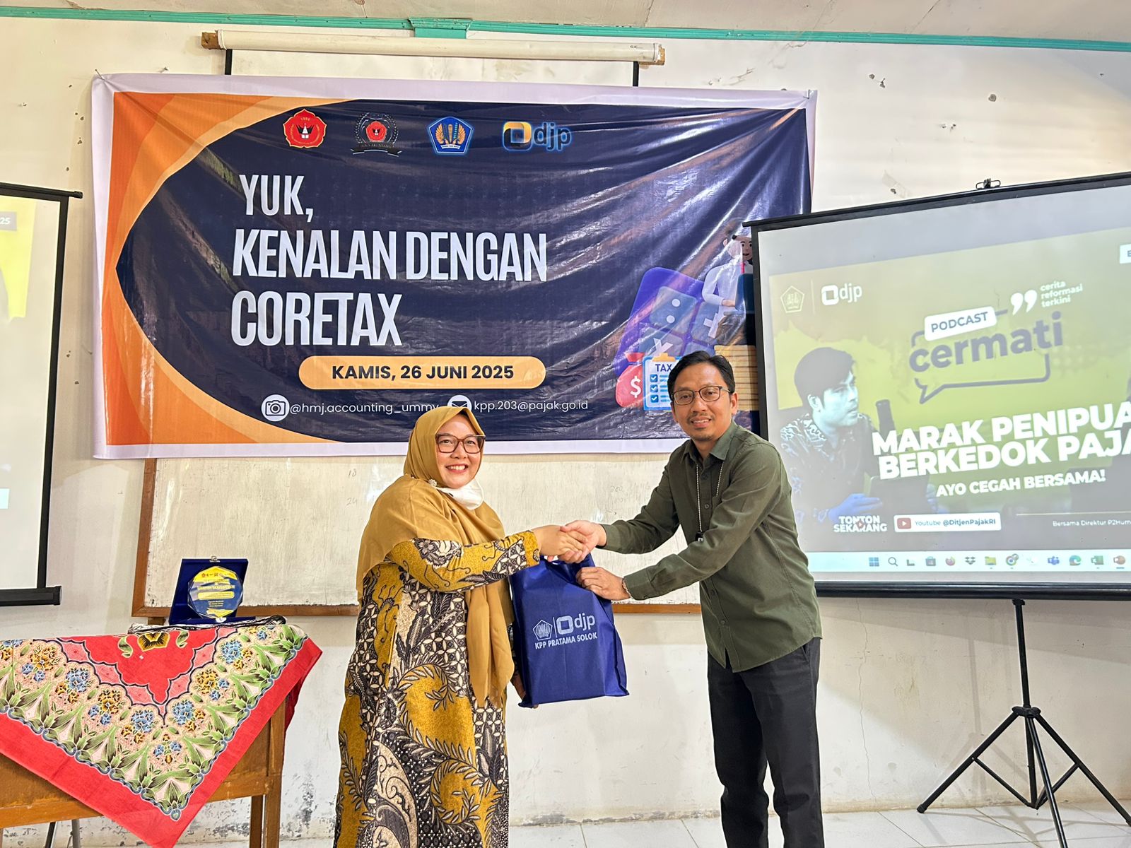 Kantor Pelayanan Pajak (KPP) Pratama Solok kembali menunjukkan komitmennya dalam edukasi perpajakan generasi muda melalui kerja sama dengan Tax Center Universitas Mahaputra Muhammad Yamin (UMMY) Solok. Kegiatan ini dikemas dalam bentuk kuliah umum bertajuk “Yuk Kenalan dengan Coretax” yang diselenggarakan di Kampus 2 UMMY Solok, Kota Solok (Kamis, 26/6).