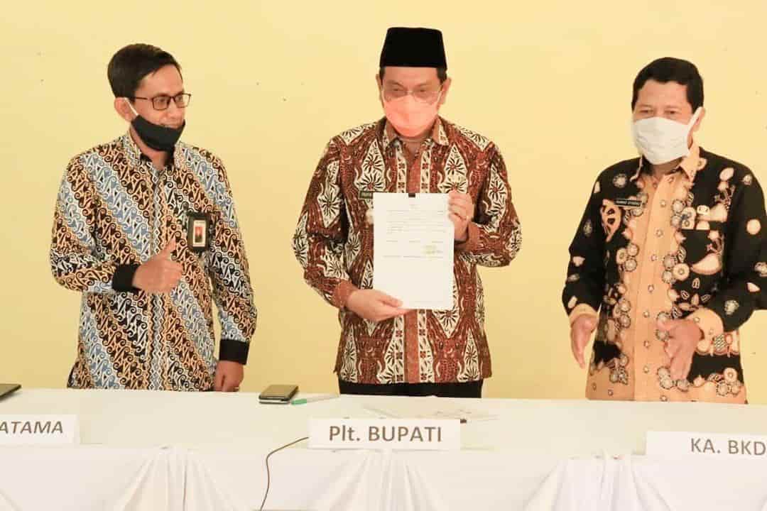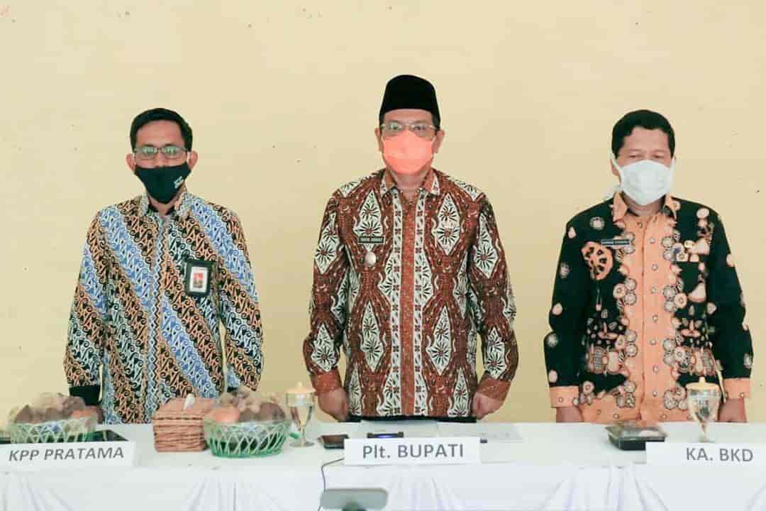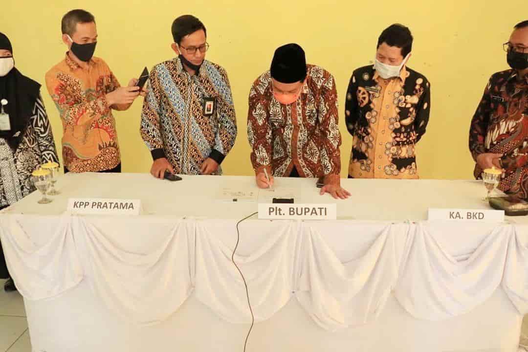 Plt. Bupati Indramayu H. Taufik Hidayat dengan Direktorat Jenderal Pajak dalam hal ini diwakili oleh KPP Pratama Indramayu, dan Direktorat Jenderal Perimbangan Keuangan menandatangani perjanjian kerja sama sinergi optimalisasi penerimaan pajak pusat dan daerah (Rabu, 26/8). Prosesi penandatangan dilakukan secara virtual di Aula Kantor Kecamatan Losarang serentak dengan 78 Pemerintah Daerah di seluruh Indonesia.
