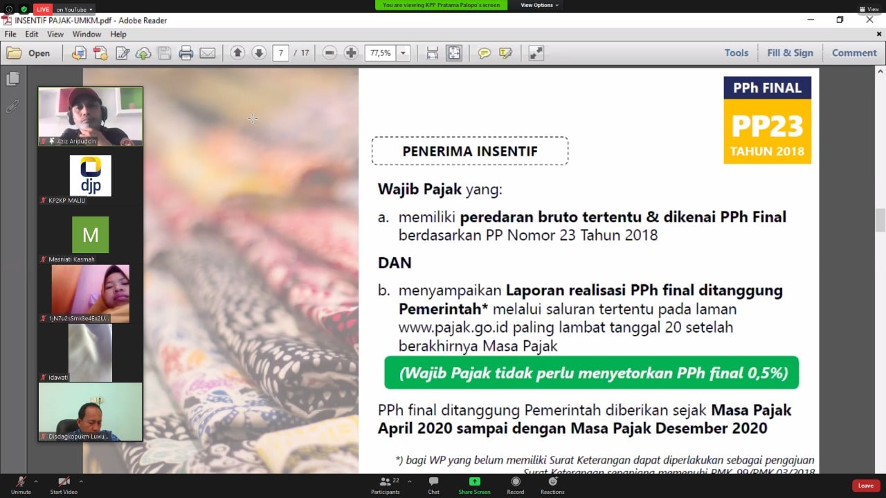Kantor Pelayanan Pajak (KPP) Pratama Palopo dan Kantor Pelayanan, Penyuluhan, dan Konsultasi Perpajakan (KP2KP) Malili mengadakan Business Development Services (BDS) secara virtual bagi pelaku Usaha Mikro, Kecil, dan Menengah di Kota Palopo dan Kabupaten Luwu Timur (Kamis, 17/9).