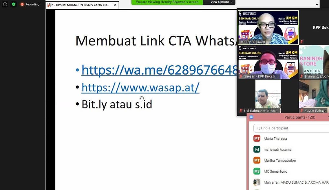 Berkomitmen untuk bantu pengusaha bersaing saat pandemi, KPP Pratama Bekasi Utara gandeng pegiat Usaha Mikro Kecil dan Menengah (UMKM) Rumah Kreatif Badan Usaha Milik Negara (BUMN) Bekasi dan Wanita Bekasi Keren serta praktisi pemasaran digital untuk gelar seminar daring. Seminar yang diikuti 161 UMKM di wilayah Kota dan Kabupaten Bekasi ini dilaksanakan melalui aplikasi zoom meeting di Bekasi (Rabu, 14/10).