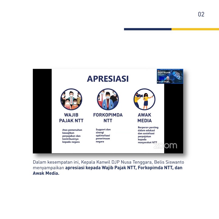 Turut hadir dalam kegiatan ini secara virtual adalah Para Kepala KPPN, Kepala KPP Pratama, Kepala KPPBC dan Kepala KPKNL lingkungan Provinsi Nusa Tenggara Timur. Dalam kesempatan ini Kepala Kanwil DJP Nusa Tenggara, Belis Siswanto, menuturkan apresiasinya kepada para wajib pajak NTT, Forkopimda NTT, dan para awak media, serta mengajak #kawanpajak untuk memanfaatkan insentif pajak demi pemulihan ekonomi nasional.