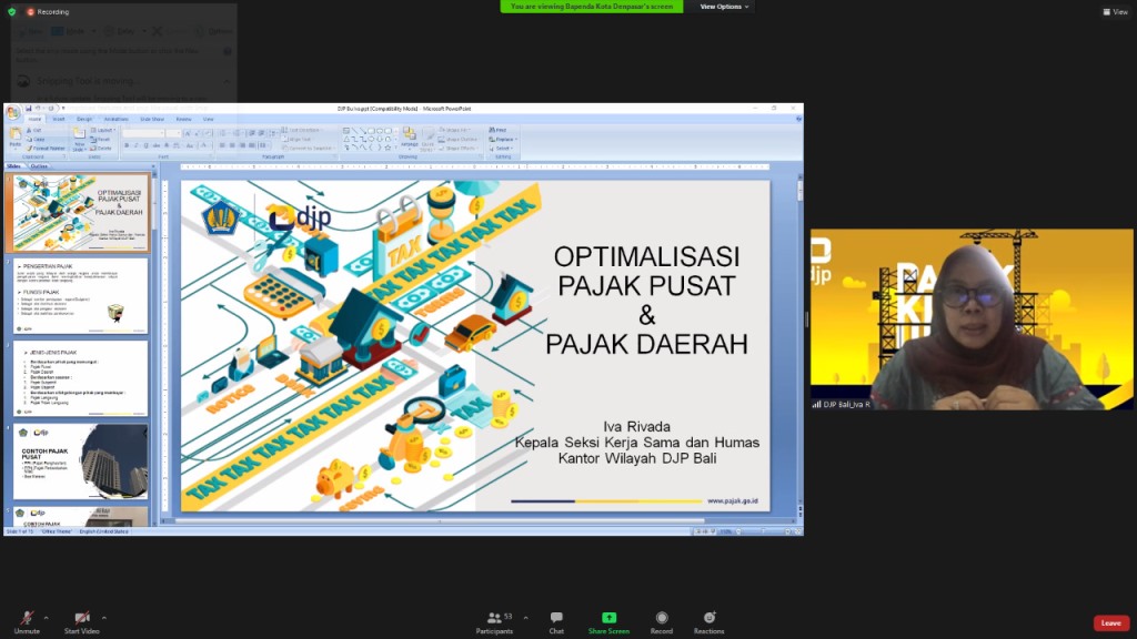 Kantor Wilayah Direktorat Jenderal Pajak Bali (Kanwil DJP Bali) menghadiri undangan dari Badan Pendapatan Daerah (Bapenda) Kota Denpasar secara daring di Bali (Rabu, 24/2). Kegiatan yang bertema Forum Perangkat Daerah ini dihadiri 50 lebih perwakilan instansi pemerintah di lingkungan Kota Denpasar.