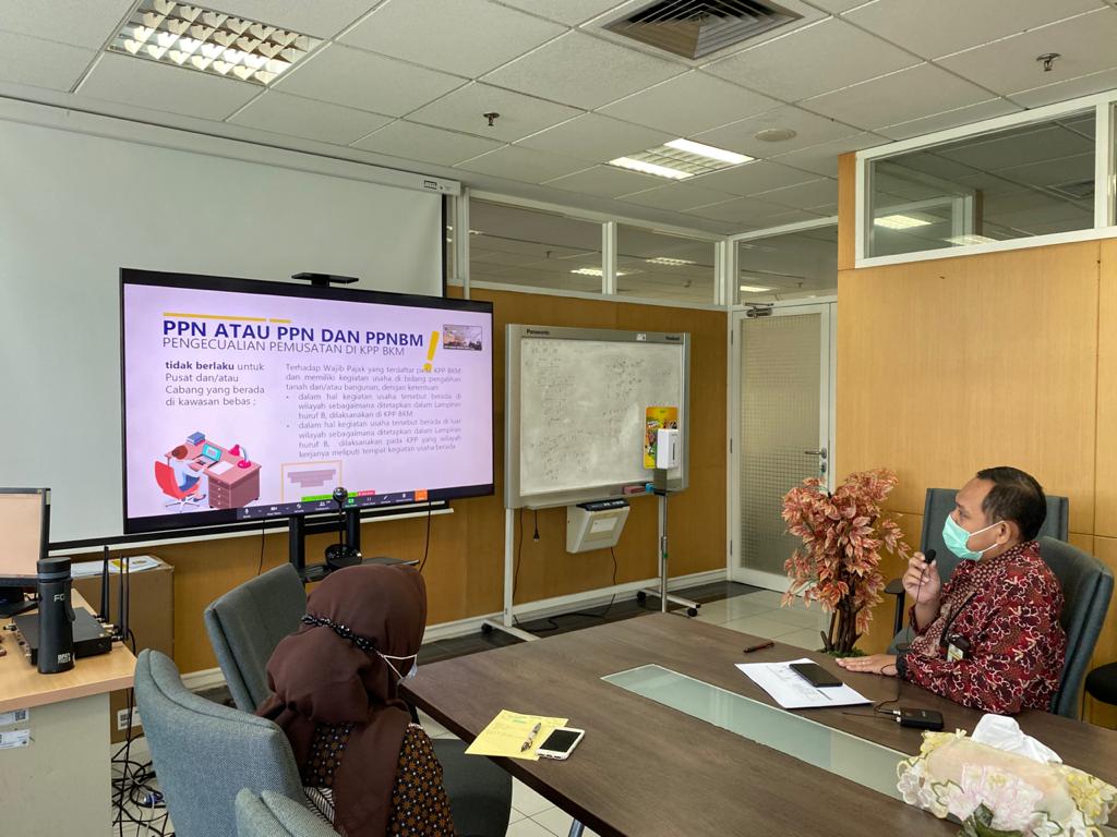Tim penyuluh menyampaikan materi sesuai Peraturan Dirjen Pajak nomor PER-05/PJ/2021 tentang Perubahan atas PER-07/PJ/2020 Tempat Pendaftaran Wajib Pajak dan Pelaku Usaha melalui Sistem Elektronik dan/atau Tempat Pelaporan Usaha Pengusaha Kena Pajak pada Kantor Pelayanan Pajak di Lingkungan Kantor Wilayah Direktorat Jenderal Pajak Wajib Pajak Besar, Kantor Pelayanan Pajak di Lingkungan Kantor Wilayah Direktorat Jenderal Pajak Wajib Pajak Jakarta Khusus, dan Kantor Pelayanan Pajak Madya.