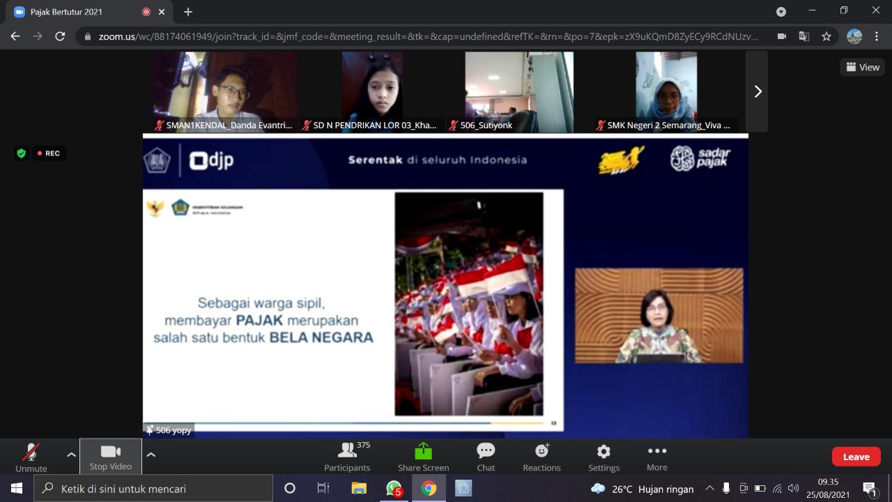 Kantor Wilayah Direktorat Jenderal Pajak (Kanwil DJP) Jawa Tengah I bekerja sama dengan Kantor Pelayanan, Penyuluhan dan Konsultasi Perpajakan (KP2KP) Kendal mengadakan kegiatan Pajak Bertutur yang diikuti oleh 30 peserta dari Sekolah Menengah Atas Negeri (SMA N) 1 Kendal dan Sekolah Menengah Kejuruan Negeri (SMK N) 1 Kendal di Kendal (Rabu, 25/8). Pajak Bertutur tahun ini hadir dengan tema “Generasi Muda Sadar Pajak Wujud Bela Negara”.