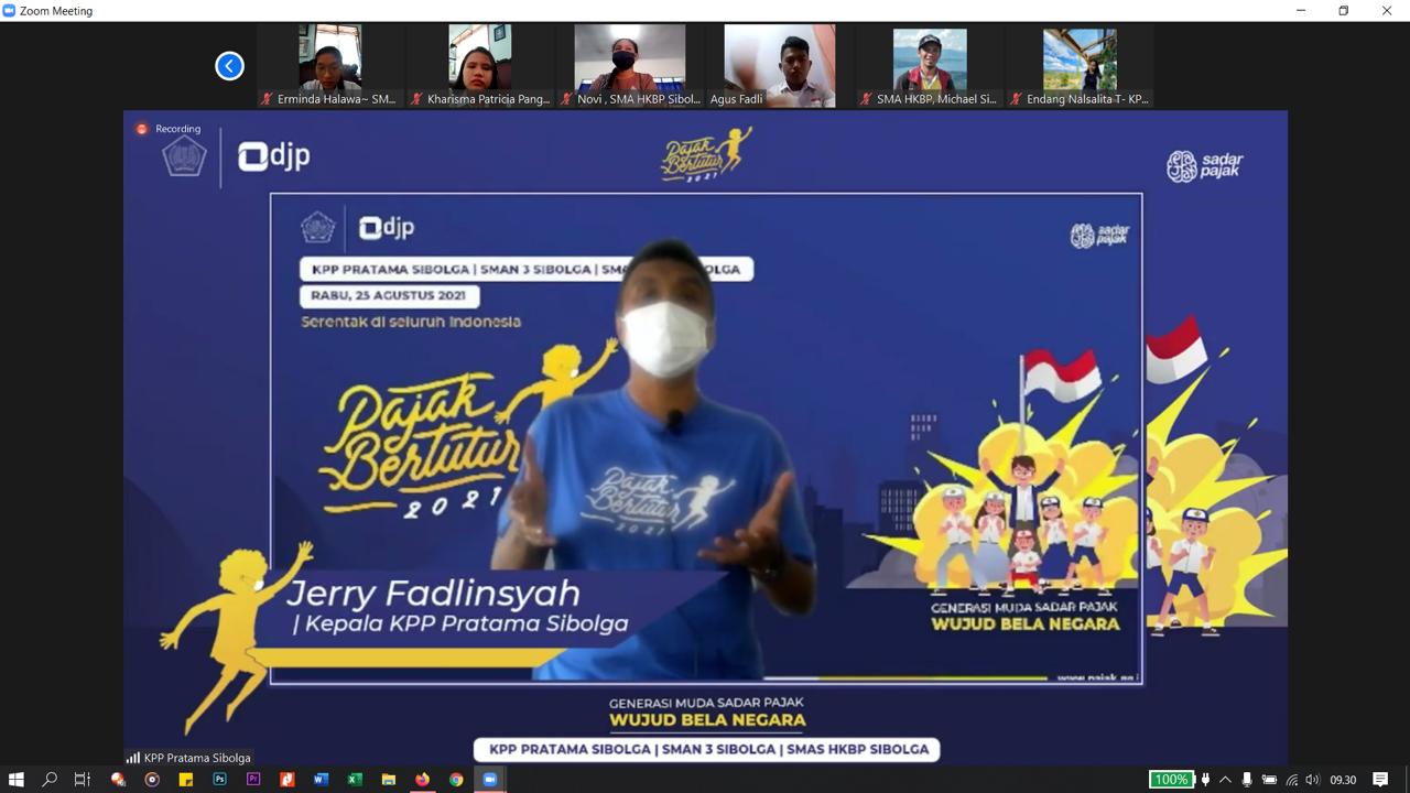 Kantor Pelayanan Pajak (KPP) Pratama Sibolga menyelenggarakan kegiatan Pajak Bertutur 2021 melalui aplikasi Zoom Meeting di ruang rapat KPP Pratama Sibolga, Kota Sibolga, Sumatera Utara (Rabu, 25/8). Sebanyak 60 peserta mengikuti acara ini yang terdiri dari para siswa/i SMA Swasta HKBP Sibolga dan SMAN 3 Sibolga.
