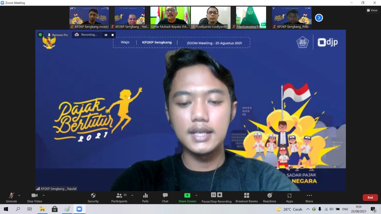 Kantor Pelayanan, Penyuluhan, dan Konsultasi Perpajakan (KP2KP) Sengkang menyelenggarakan acara sosialisasi pada generasi muda yang dikemas melalui program Pajak Bertutur dengan menggandeng pelajar dari SMPN 1 Wajo (Rabu, 25/8). Kegiatan ini dilangsungkan secara daring via aplikasi zoom meeting di ruang kelas pajak KP2KP Sengkang, Kabupaten Wajo.