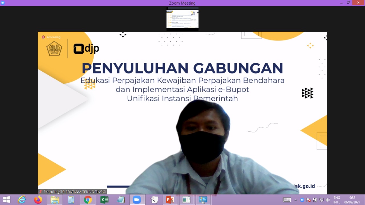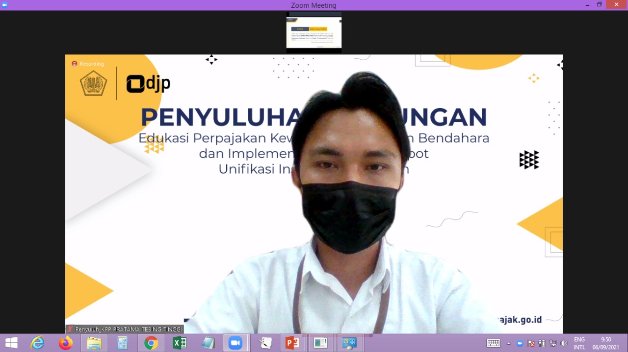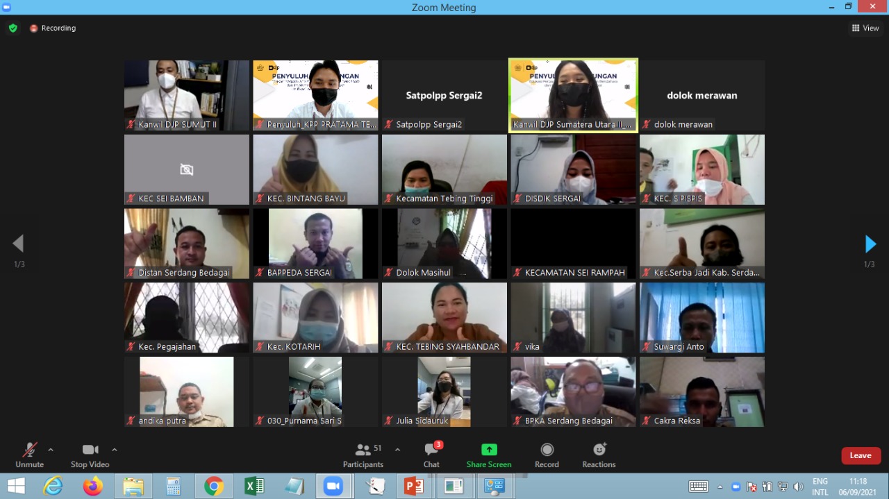 Kantor Pelayanan Pajak (KPP) Pratama Tebing Tinggi bersama Kantor Wilayah (Kanwil) Direktorat Jenderal Pajak (DJP) Sumatera Utara II mengadakan edukasi perpajakan bagi Bendahara Instansi Pemerintah se-Kabupaten Serdang Bedagai. Kegiatan tersebut dilaksanakan secara webinar menggunakan media Zoom Meeting di ruang aula Lantai II KPP Pratama Tebing Tinggi, Tebing Tinggi (Senin, 6/9).