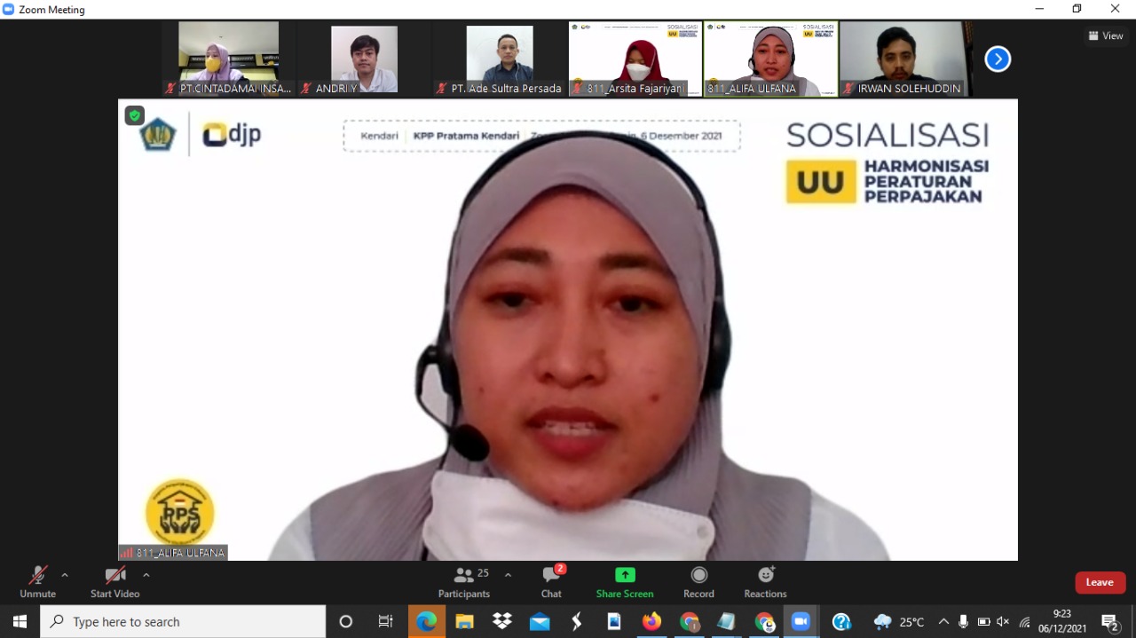 Kantor Pelayanan Pajak (KPP) Pratama Kendari menyelenggarakan kelas pajak online dengan mengundang Wajib Pajak Strategis dan Wajib Pajak Orang Pribadi serta Badan yang berada di wilayah Kota Kendari dan Kabupaten Konawe (Senin, 6/12). Tim penyuluh pajak KPP Pratama Kendari memandu langsung jalannya acara melalui media zoom meeting dari ruang rapat KPP Pratama Kendari, Kota Kendari.