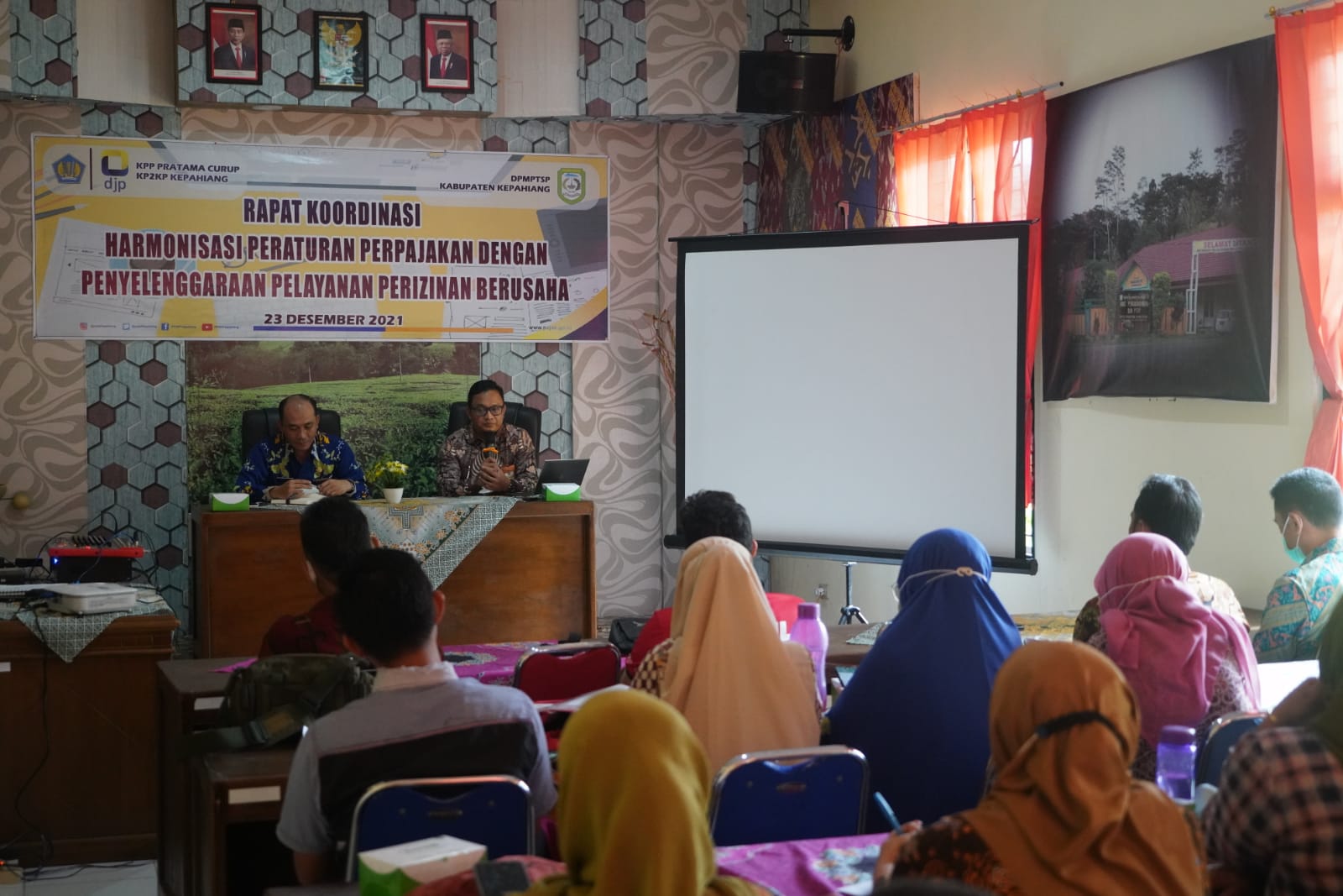 Kantor Pelayanan Penyuluhan dan Konsultasi Perpajakan (KP2KP) Kepahiang bersama Dinas Penanaman Modal dan Pelayanan Terpadu Satu Pintu (DPMPTSP) Kepahiang telah melaksanakan sosialisasi yang diselenggarakan di Aula DPMPTSP Kepahiang, Kecamatan Kepahiang, Kabupaten Kepahiang, Bengkulu (Kamis, 23/12). Kegiatan yang diikuti 25 Wajib Pajak ini membahas tentang Undang-Undang Harmonisasi Peraturan Perpajakan (UU HPP).