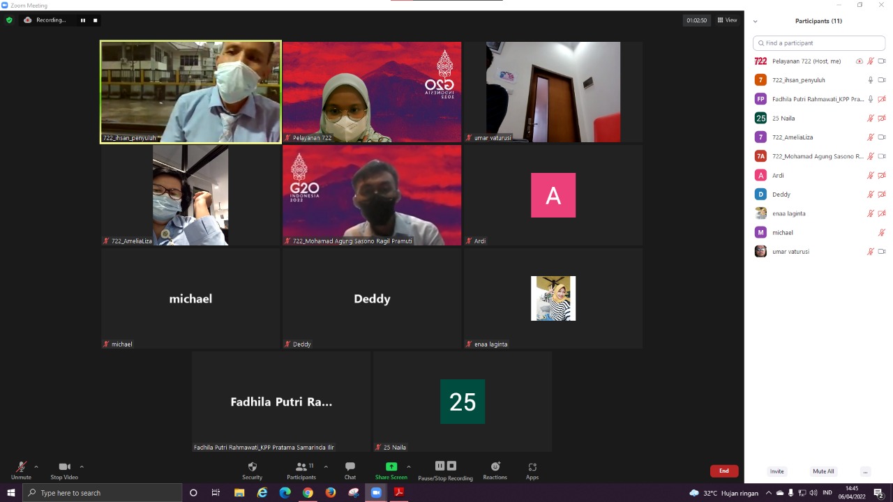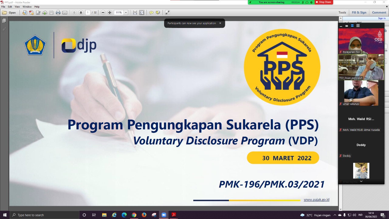 Kantor Pelayanan Pajak (KPP) Pratama Samarinda Ilir menyelenggarakan kelas pajak yang membahas seputar Program Pengungkapan Sukarela (PPS) melalui zoom meetings di Ruang Sinergi KPP Pratama Samarinda Kota Samarinda (Rabu, 06/04).