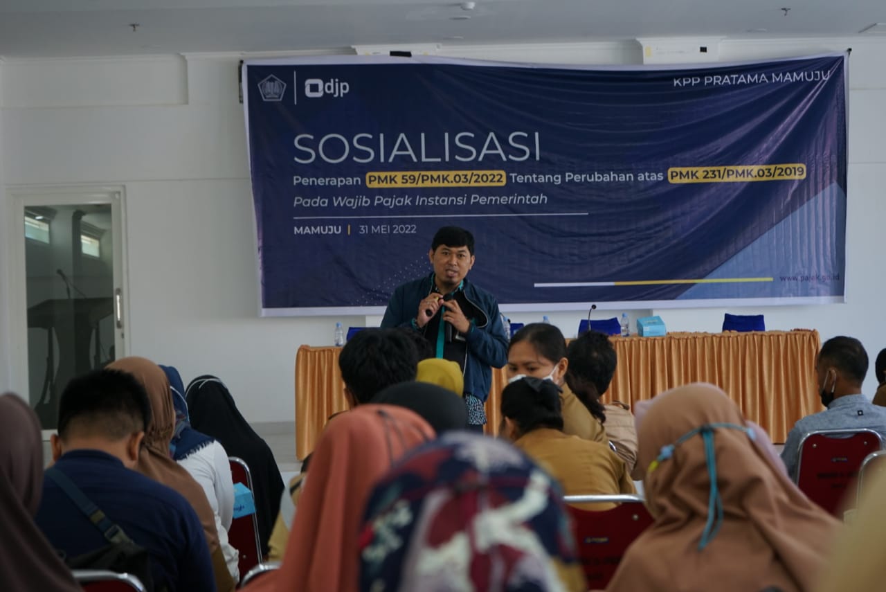 Kantor Pelayanan Pajak (KPP) Pratama Mamuju mengadakan acara Sosialisasi PMK Nomor 58/PMK.03/2022 dan 59/PMK.03/2022 yang merupakan turunan dari Undang-Undang Harmonisasi Peraturan Perpajakan (UU HPP) di Aula Bupati Mamuju, Kabupaten Mamuju (Selasa, 31/5).