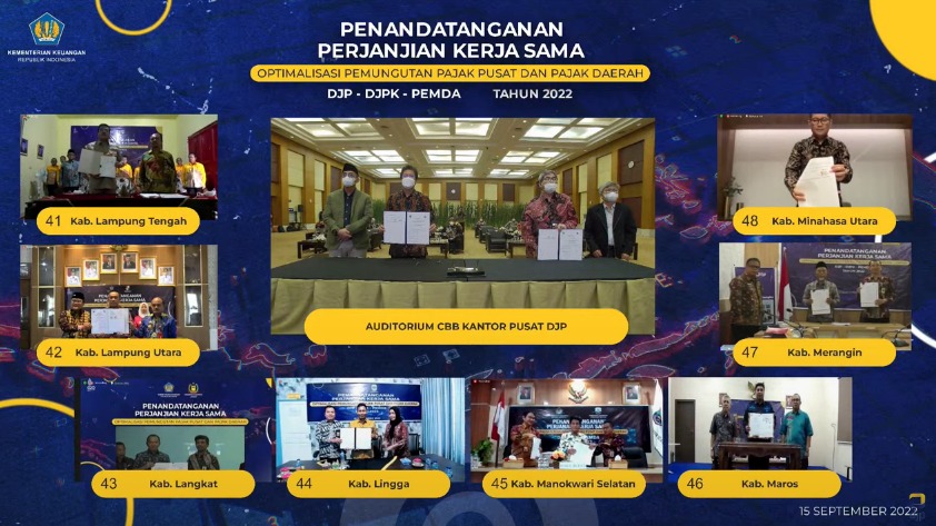 Acara secara daring dilakukan di tiap-tiap Pemda yang ikut serta dalam perjanjian ini. Sedangkan secara luring (kehadiran fisik secara terbatas) dihadiri pejabat-pejabat dari DJP dan DJPK yang bertempat di Aula Cakti Buddhi Bakti (CBB), Gedung Marie Muhammad, Kantor Pusat Direktorat Jenderal Pajak, Jakarta.
