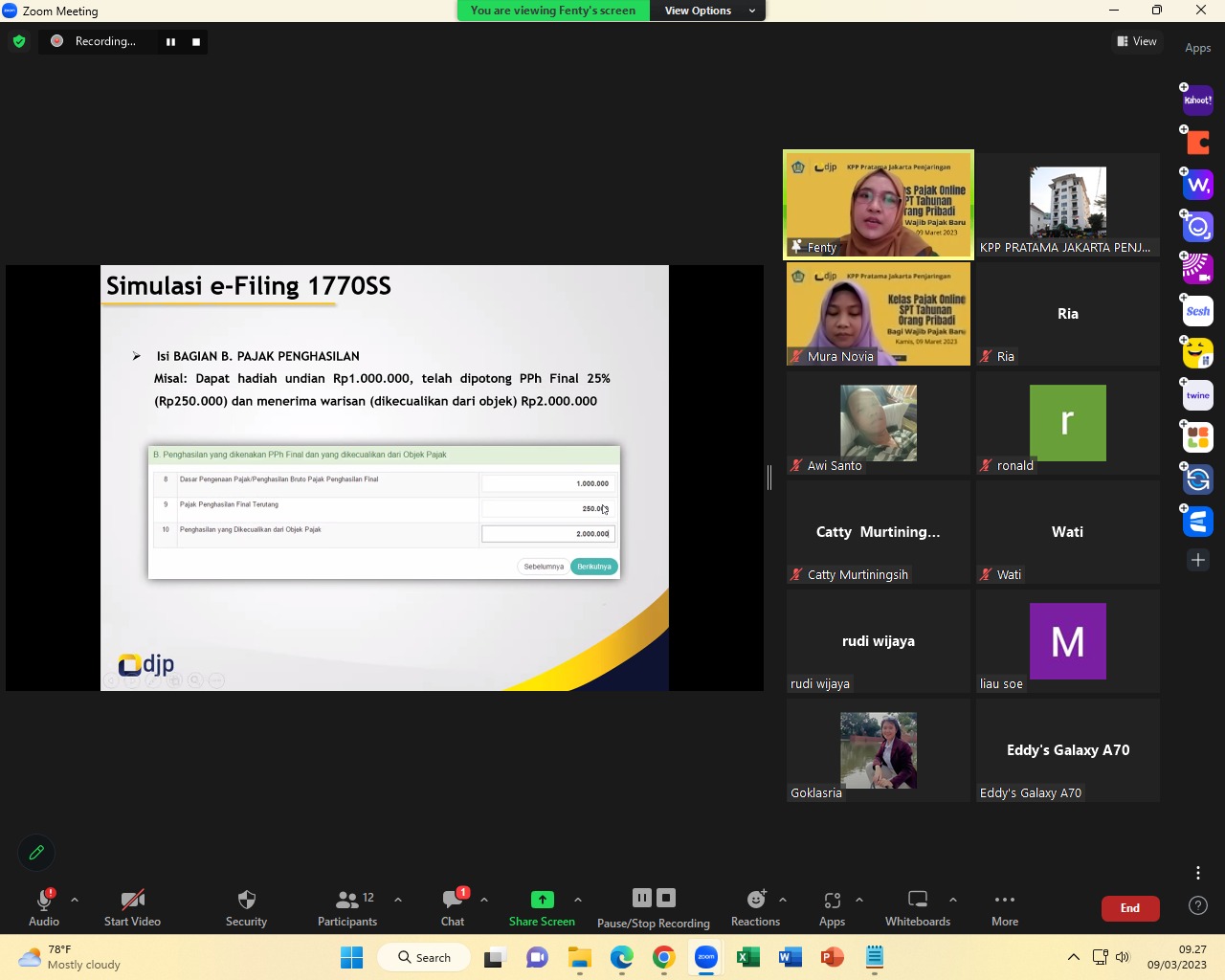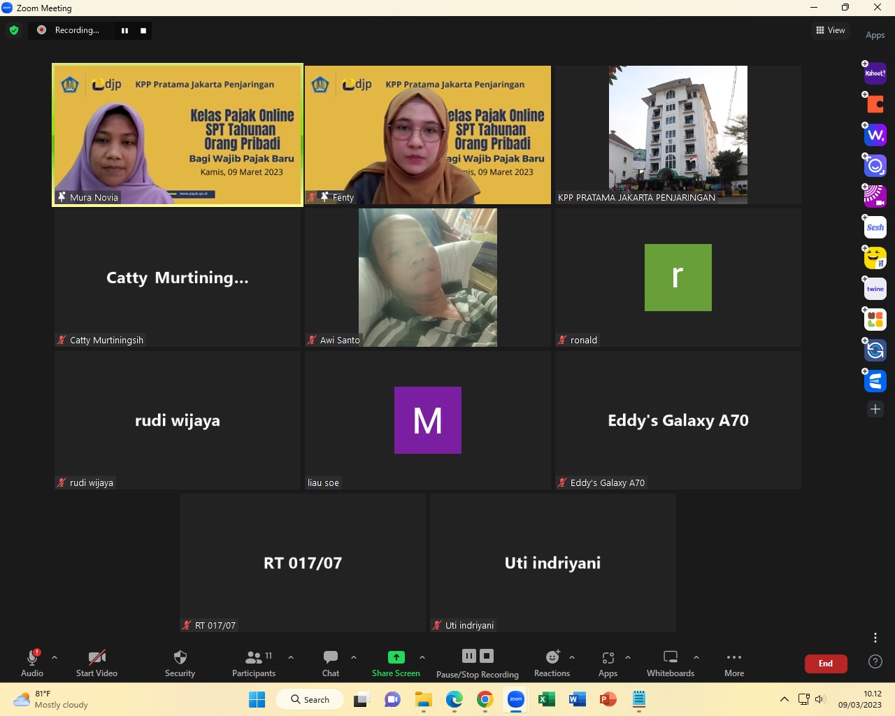 Kantor Pelayanan Pajak (KPP) Pratama Jakarta Penjaringan menyelenggarakan kelas pajak secara daring mengenai cara melaporkan SPT Tahunan PPh Orang Pribadi (Kamis, 9/3). Kegiatan dilaksanakan pukul 09.00 s.d. 11.00 WIB melalui Aplikasi Zoom dan diikuti sepuluh Wajib Pajak Orang Pribadi Non-PKP yang berdomisili di sekitar wilayah Penjaringan Jakarta Utara.