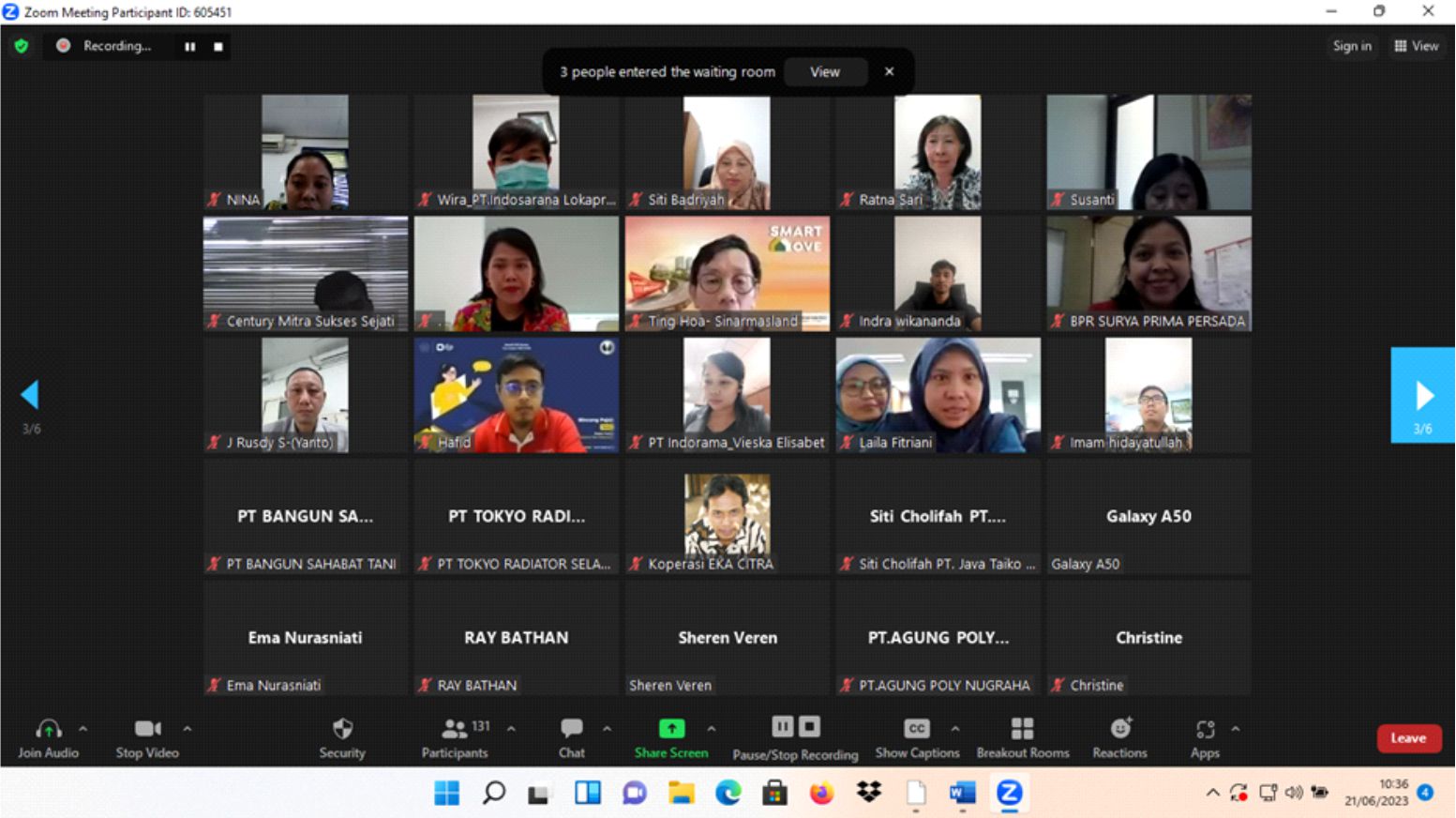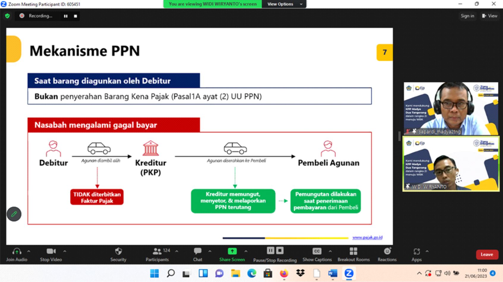 Penyuluh Kantor Pelayanan Pajak (KPP) Madya Dua Tangerang mengadakan kelas pajak secara daring dengan tema PMK 41 Tahun 2023 langsung dari Ruang Rapat KPP Madya Dua Tangerang, Blok U No. 5, Jalan Scientia Boulevard, Curug Sangereng, Kecamatan Kelapa Dua, Kabupaten Tangerang, Banten (Rabu, 21/6).
