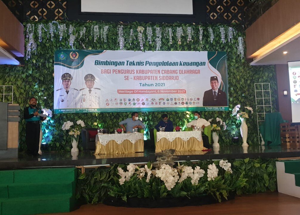 Kegiatan bimbingan teknis pengelolaan keuangan bagi pengurus kabupaten cabang olahraga se-Kabupaten Sidoarjo tersebut dihadiri 100 orang peserta. Materi yang dibahas adalah mengenai "Tata Cara Penggunaan Pajak Pengelolaan Dana Hibah KONI Tahun Anggaran 2021". Acara diisi oleh tiga narasumber, yaitu dari KPP Pratama Sidoarjo Selatan, Kejaksaan Negeri Sidoarjo, dan Pemerintah Daerah Kab. Sidoarjo.