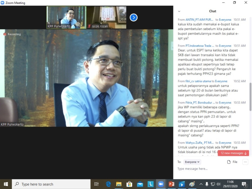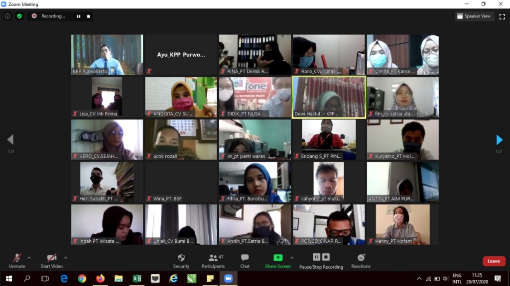 KPP Pratama Purwokerto menggelar Edukasi Perpajakan e-Bupot PPh Pasal 23/26 secara daring kepada Pengusaha Kena Pajak (PKP) di Wilayah Kabupaten Banyumas melalui media telekonferensi di KPP Pratama Purwokerto (Rabu, 29/7). Edukasi ini dilaksanakan dalam dua hari sejak Selasa, 28 Juli 2020 dengan peserta seluruhnya berjumlah 102 wajib pajak usahawan, yakni 57 wajib pajak di hari pertama dan 45 wajib pajak di hari kedua.