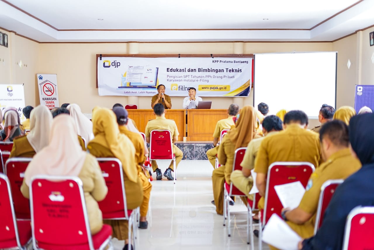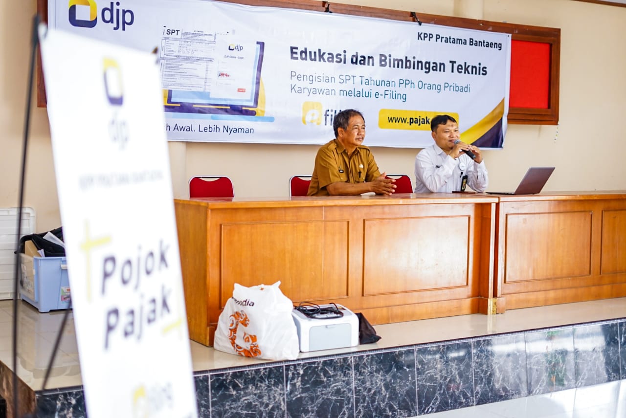 Kantor Pelayanan Pajak (KPP) Pratama Bantaeng mengadakan kegiatan Pojok Pajak dan Bimbingan Teknis Pengisian SPT Tahunan PPh Orang Pribadi Karyawan melalui e-Filing yang ditujukan untuk Aparatur Sipil Negara (ASN) di lingkungan Kecamatan Bantaeng dan Bissappu (Rabu, 10/2). Kegiatan ini dilaksanakan di ruang aula Kantor Camat Kabupaten Bantaeng dengan dihadiri oleh 120 ASN sebagai peserta kegiatan.