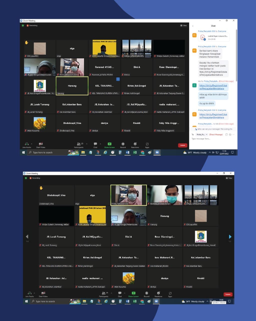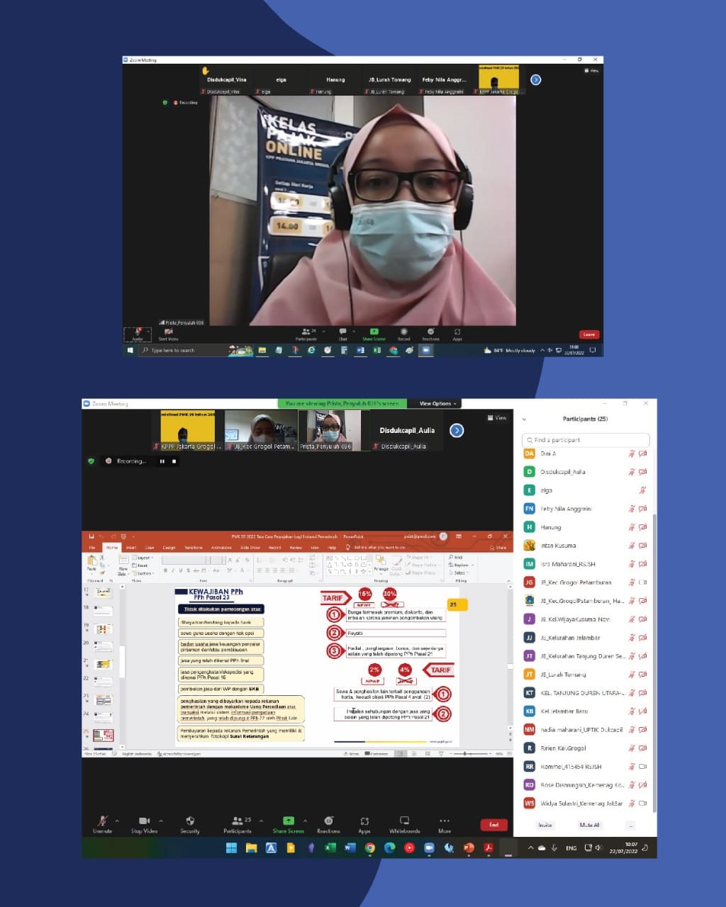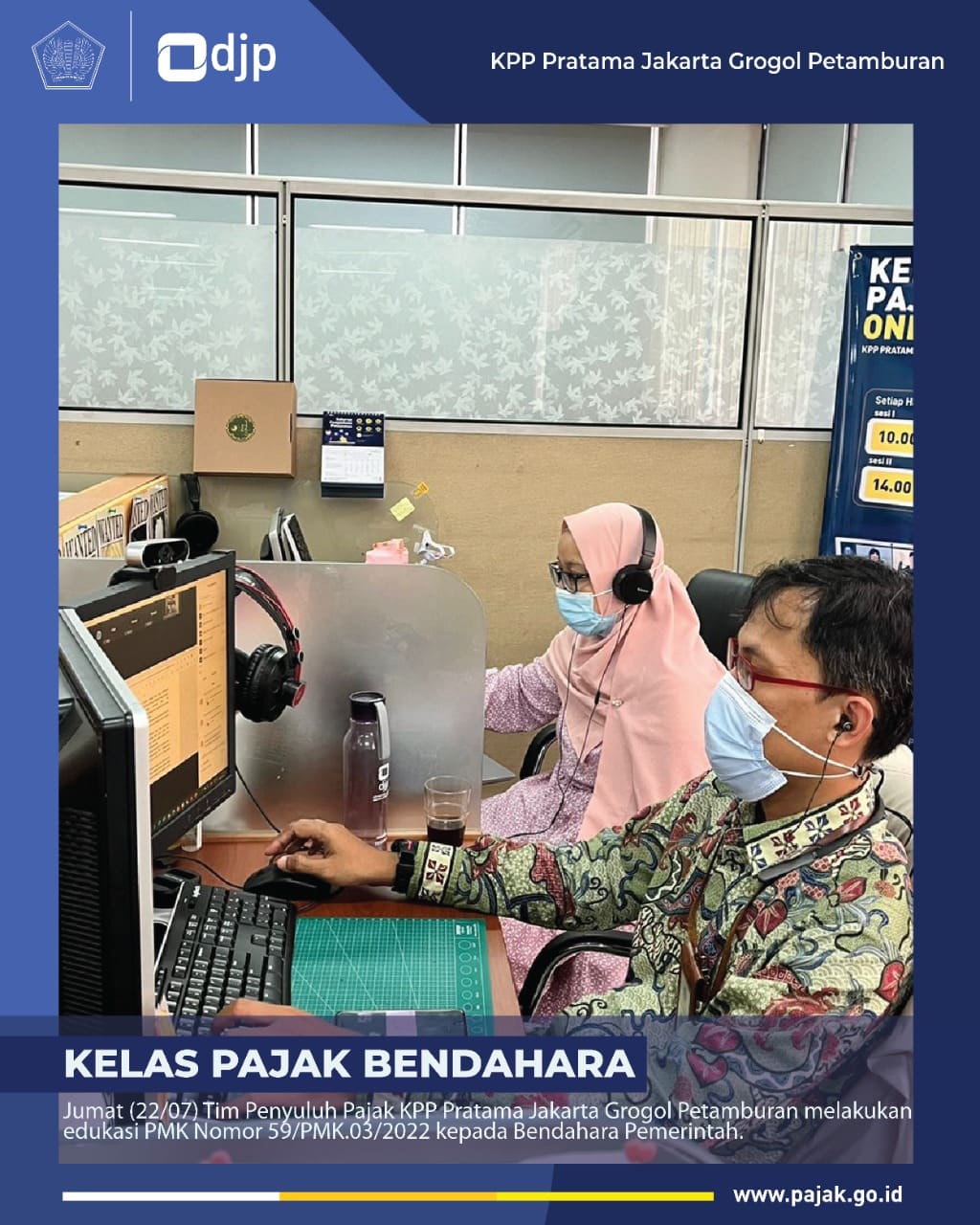 Kantor Pelayanan Pajak (KPP) Pratama Jakarta Grogol Petamburan melakukan sosialisasi Peraturan Menteri Keuangan Nomor 59/PMK.03/2022 secara daring melalui Zoom Meeting (Jumat, 22/07). Kegiatan sosialisasi ini diikuti oleh 15 bendahara pemerintah di wilayah Kecamatan Grogol Petamburan.