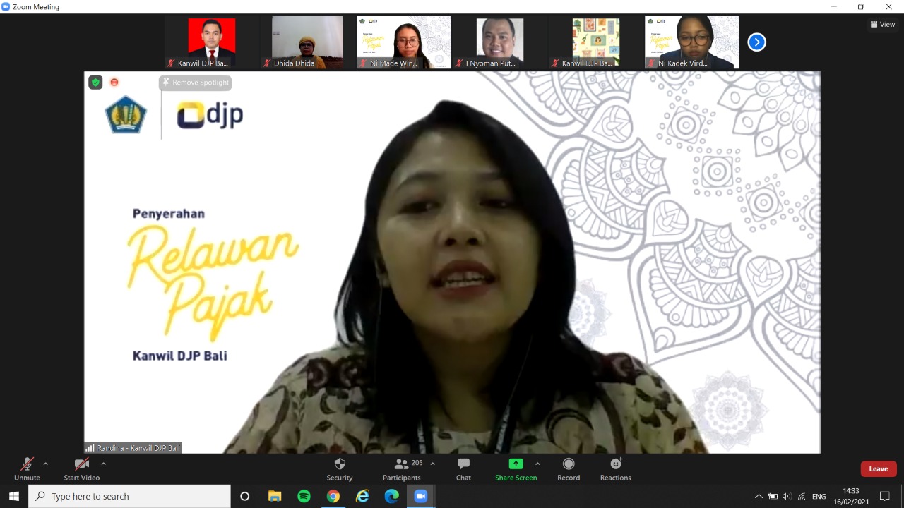 Kantor Wilayah Direktorat Jenderal Pajak Bali (Kanwil DJP Bali) mengadakan kegiatan pelepasan relawan pajak tahun 2021 melalui media Zoom di Bali (Selasa, 16/2). Kegiatan ini dihadiri oleh seluruh Kepala Seksi Pelayanan di lingkungan Kanwil DJP Bali, ketua tax center, dan seluruh relawan pajak.
