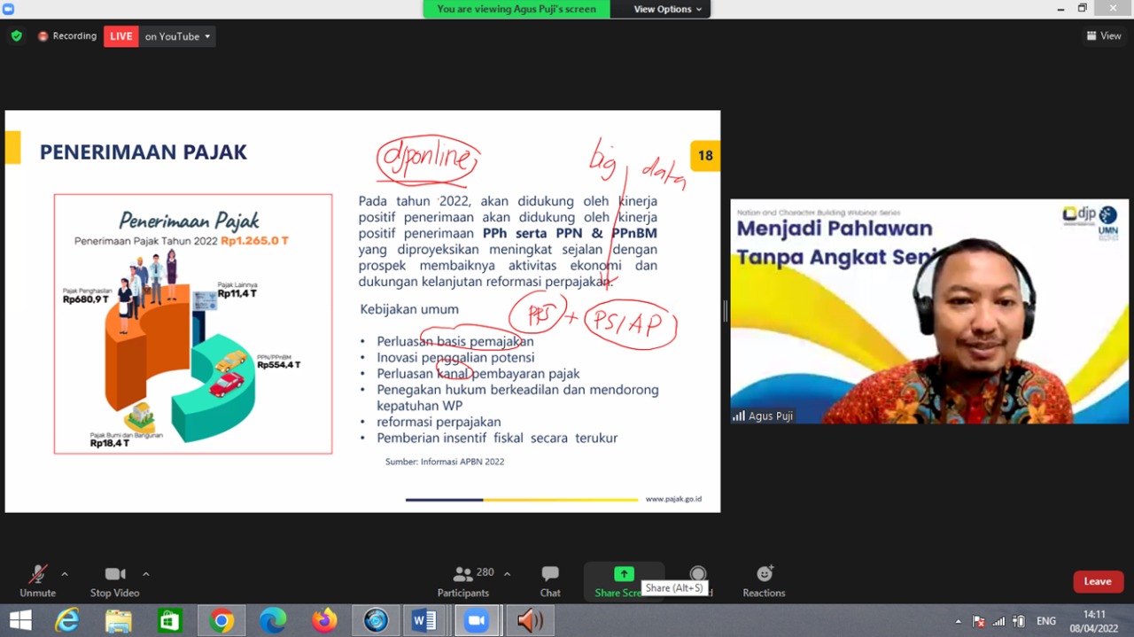 Kantor Wilayah DJP Banten bersama Tax Center Universitas Multimedia Nusantara (UMN) melakukan kegiatan webinar untuk mahasiswa secara daring melalui aplikasi zoom cloud meeting di Kota Serang, Banten (Jumat, 8/4).