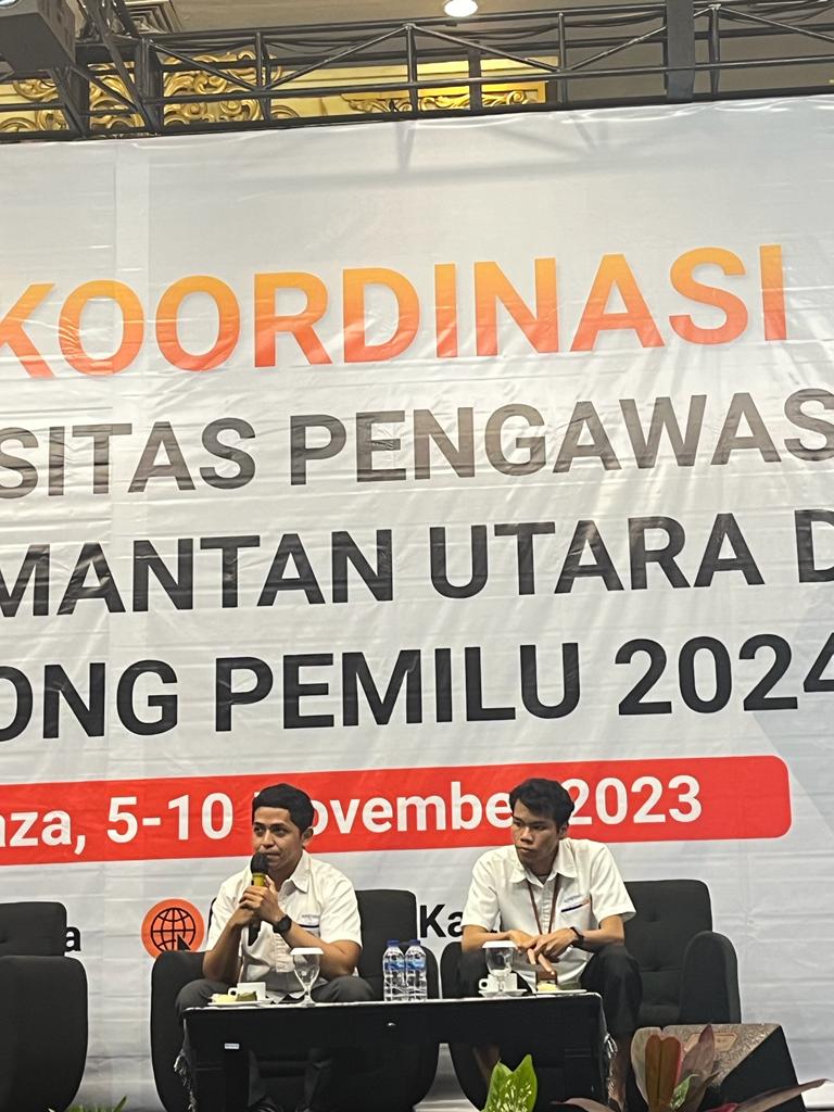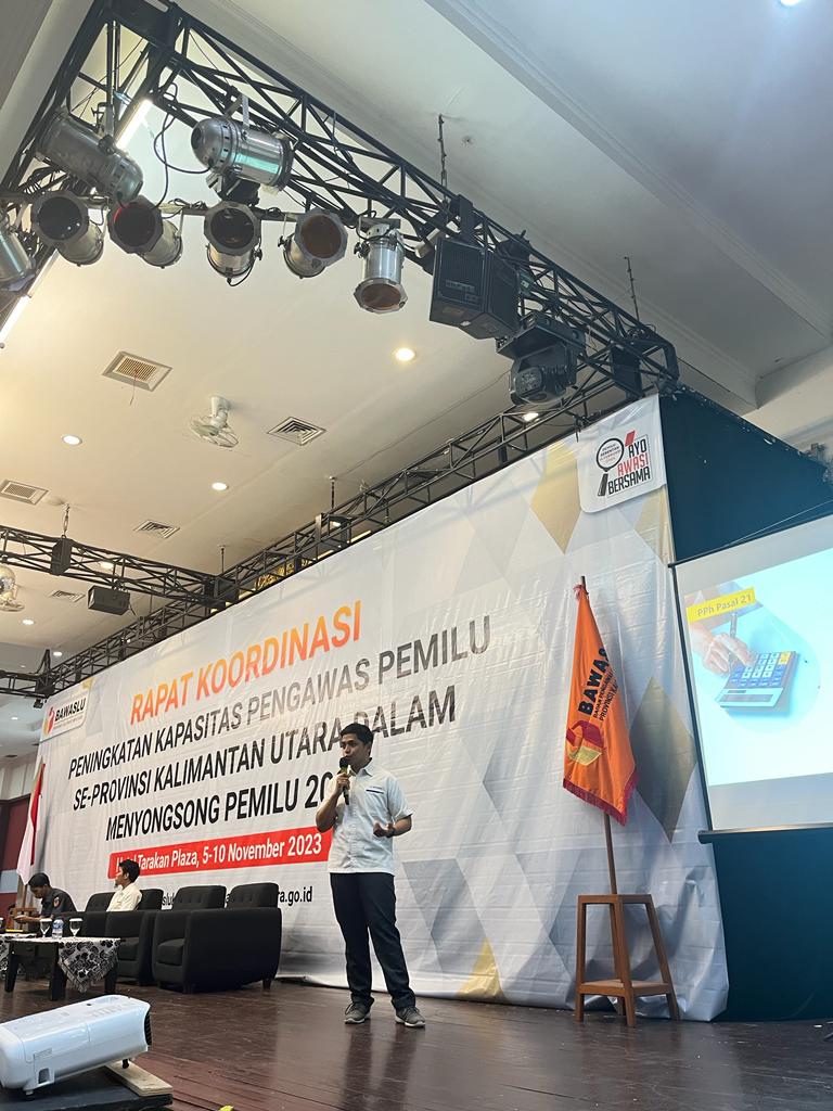 Asisten Penyuluh Pajak Kantor Pelayanan Pajak (KPP) Pratama Tanjung Redeb Is Bintoro Yuan Saputro dan Irvan Ugaharisto Selladepa menghadiri acara rapat koordinasi peningkatan kapasitas pengawas pemilu se-Provinsi Kalimantan Utara dalam menyongsong Pemilu 2024 yang di selenggarakan oleh Badan Pengawas Pemilu (Bawaslu) Kalimantan Utara di Hotel Tarakan Plaza, Jalan Yos Sudarso, Karang Balik, Tarakan Barat, Kota Tarakan, Kalimantan Utara (Senin, 6/11).