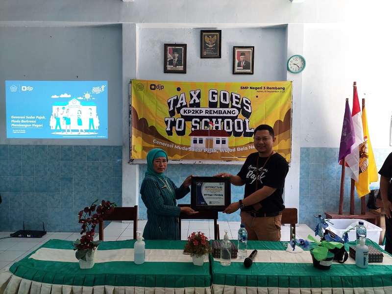 Kantor Pelayanan, Penyuluhan, dan Konsultasi Perpajakan (KP2KP) Rembang melaksanakan kegiatan Tax Goes To School bekerja sama dengan Sekolah Menengah Pertama (SMP) Negeri 3 Rembang (Kamis, 15/9).