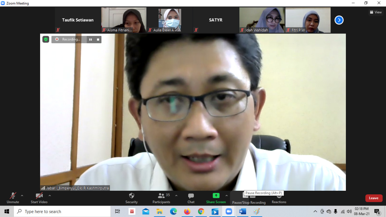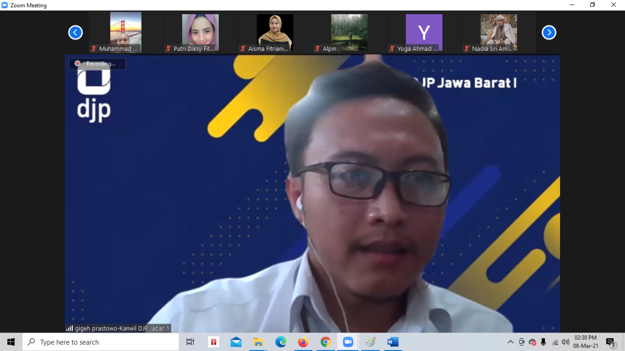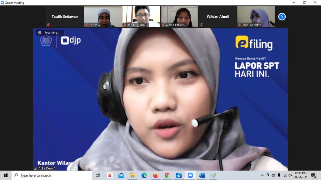 Kanwil DJP Jawa Barat I kembali menggelar bimbingan teknis SPT Tahunan secara daring di Bandung (Senin, 8/3). Kali ini, kegiatan dilakukan kepada sekitar 40-an peserta Relawan Pajak Universitas Islam Negeri Sunan Gunung Djati (UIN SGD) Bandung.