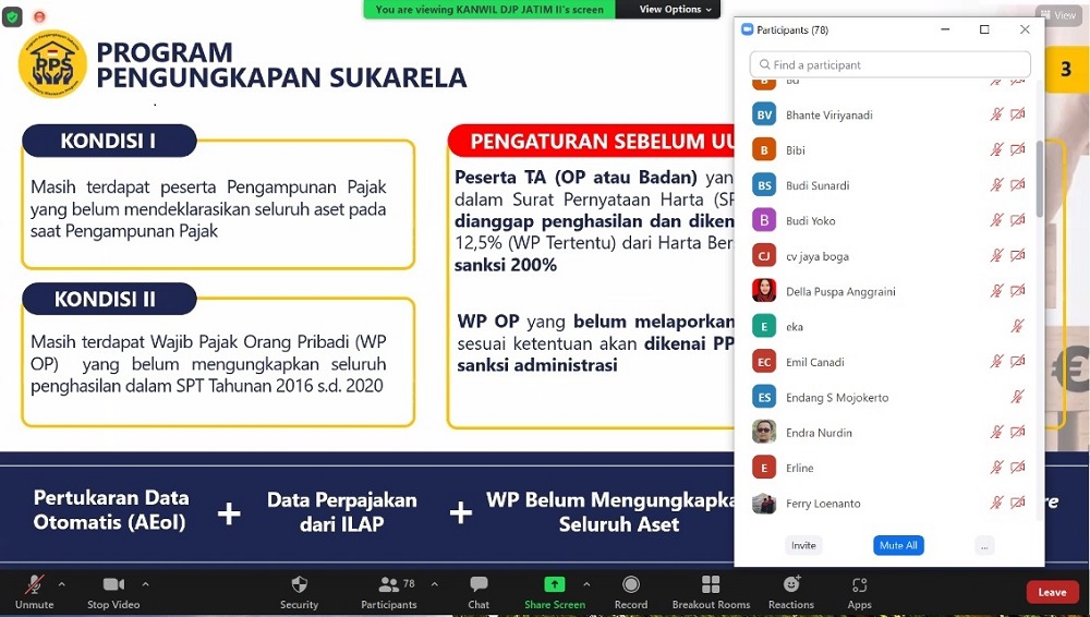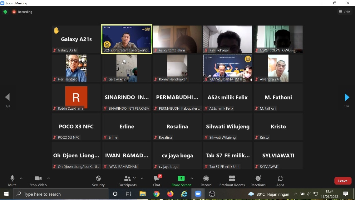 Kantor Wilayah Direktorat Jenderal Pajak (Kanwil DJP) Jawa Timur II melakukan kegiatan sosialisasi bersama Kantor Pelayanan Pajak (KPP) Pratama Mojokerto. Kegiatan ini dilaksanakan secara daring yang diikuti lebih dari 70 wajib pajak di Mojokerto (Selasa, 11/1). Dalam kegiatan ini, terdapat dua materi utama yang disampaikan. Pertama, materi Program Pengungkapan Sukarela (PPS) disampaikan oleh Chandra Hadi dan Arif Anwar Yusuf, Tim Penyuluh Pajak Kanwil DJP Jawa Timur II.