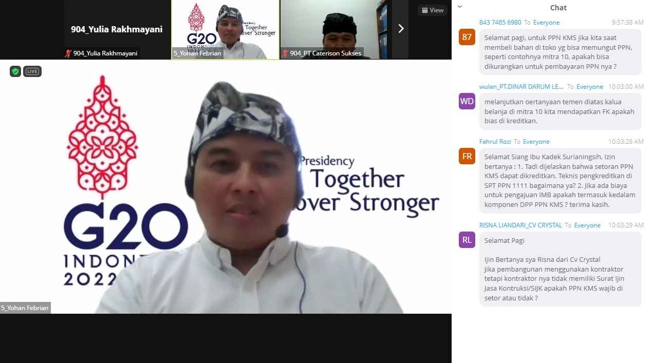 Kantor Pelayanan Pajak (KPP) Madya Denpasar kembali mengadakan kelas pajak dengan topik aturan turunan Undang–Undang Harmonisasi Peraturan Perpajakan (HPP) yang dihadiri oleh 71 Wajib Pajak Badan secara daring melalui kanal Zoom Meeting di Denpasar, Bali (Kamis, 23/06).