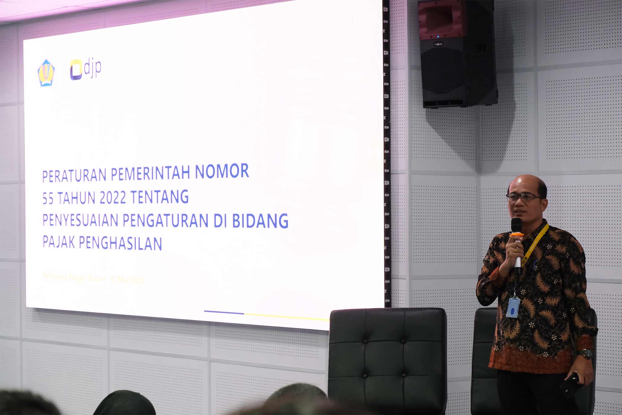 Kantor Wilayah Direktorat Jenderal Pajak Kepulauan Riau (Kanwil DJP Kepri) memberikan sosialisasi Peraturan Pemerintah Nomor 55 Tahun 2022 Tentang Penyesuaian Pengaturan Di Bidang Pajak Penghasilan kepada para mahasiswa Politeknik Negeri Batam (Polibatam) bertempat di auditorium Polibatam, Batam, Kepulauan Riau (Selasa, 30/5). Kegiatan ini diikuti oleh 80 mahasiswa jurusan akuntansi.